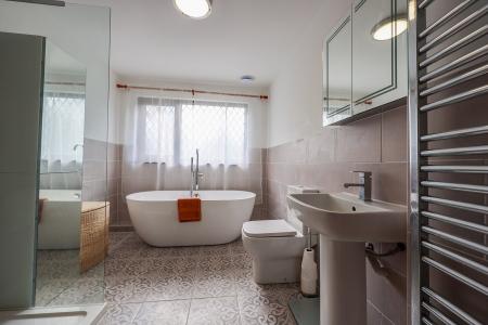 The cloakroom is well-appointed with a low-level WC and wash hand basin, complemented by tiled walls and flooring, along with a useful storage cupboard. A large roof hatch with ladder access provides easy entry to the loft space, offering excellent additional storage, which also houses the gas combination boiler, this supplies radiators and hot water.