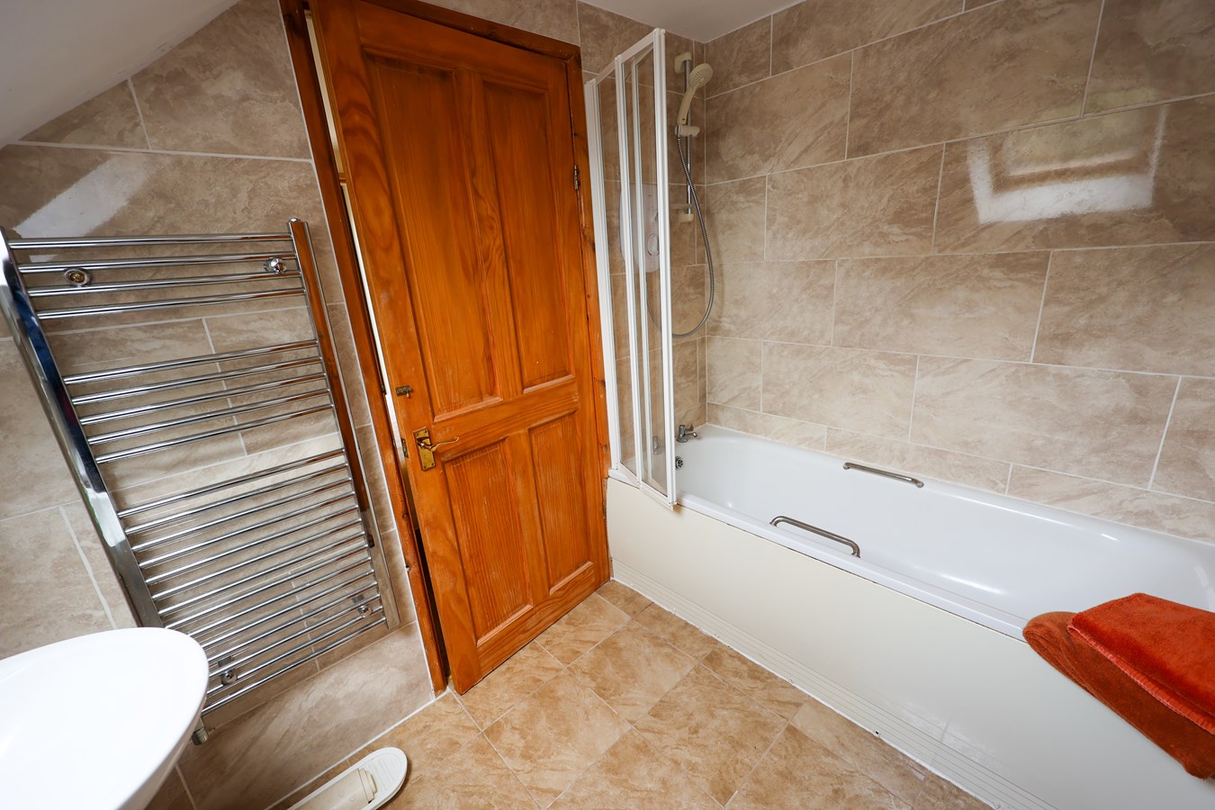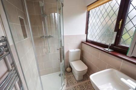 With panelled bath, electric shower over, low level W.C. wash hand basin, towel radiator. Fully tiled walls and floor.