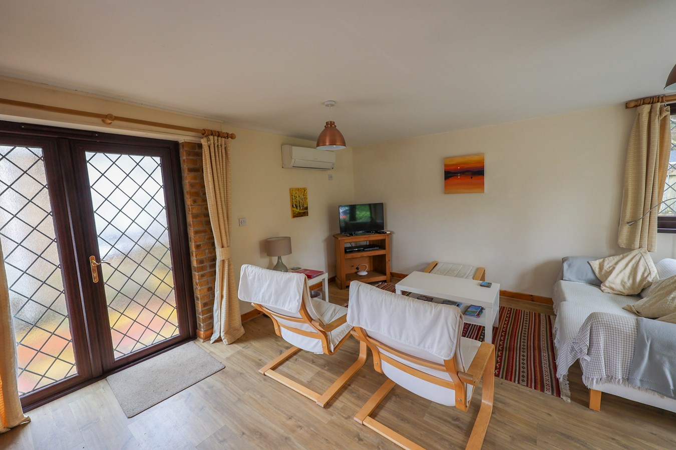 7.15m x 4.4m (23' 5" x 14' 5") overall, with full glazed leaded light door and side screen leading into the living room area, with a door to a small lobby which in turn leads to a Cloakroom/W.C. Turning stairs to the first floor and under stairs storage cupboard with hot water cylinder, French leaded light doors leading to a rear gravelled amenity area, window to the front. Wall mounted Worcester air con/heater unit.