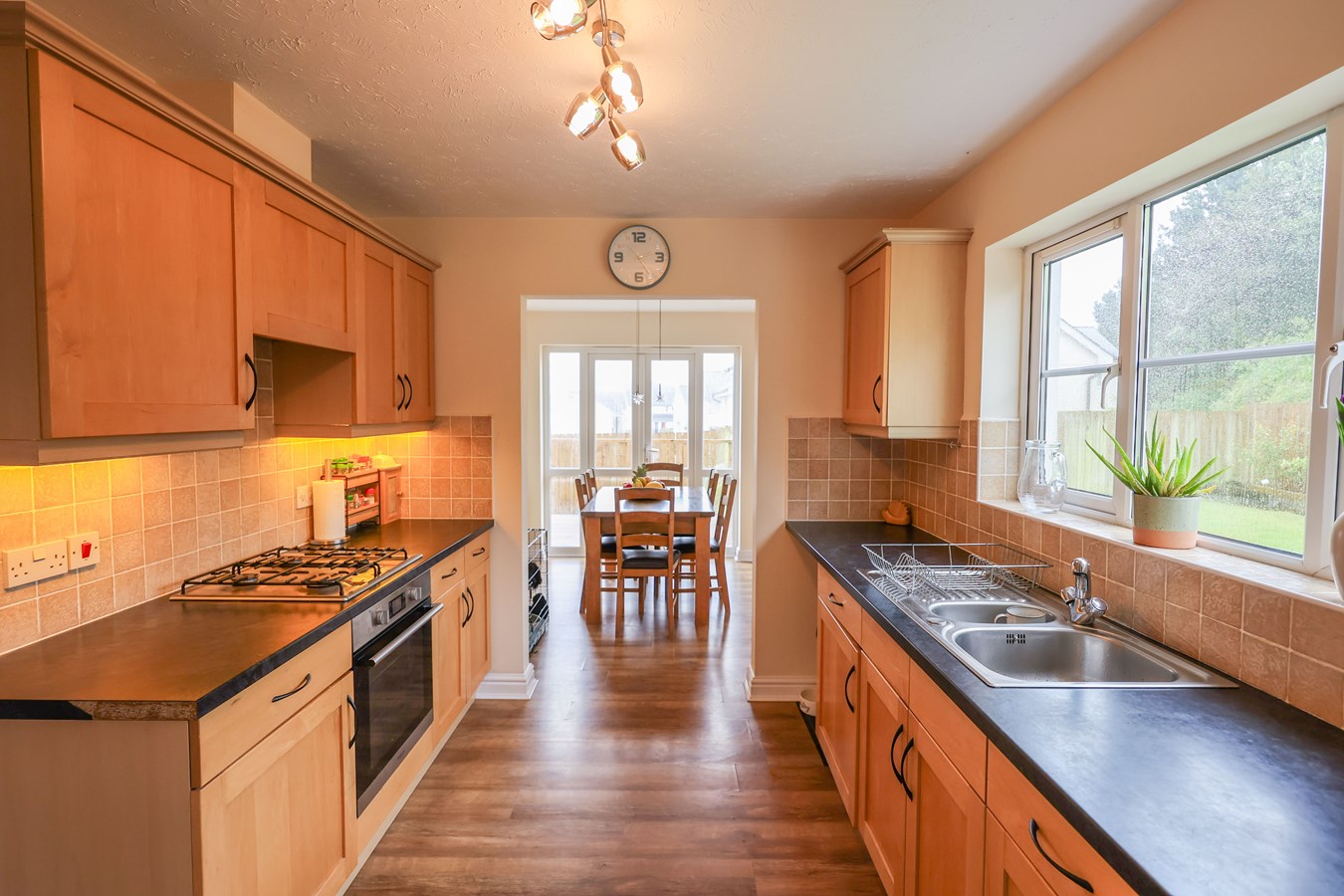 10' 3" x 8' 7" (3.12m x 2.62m) Fitted with Maple wood fronted units, built in electric oven and four ring gas hob unit with extractor above, window to the side, tiled splashback, sink unit. Door leading to the utility room.