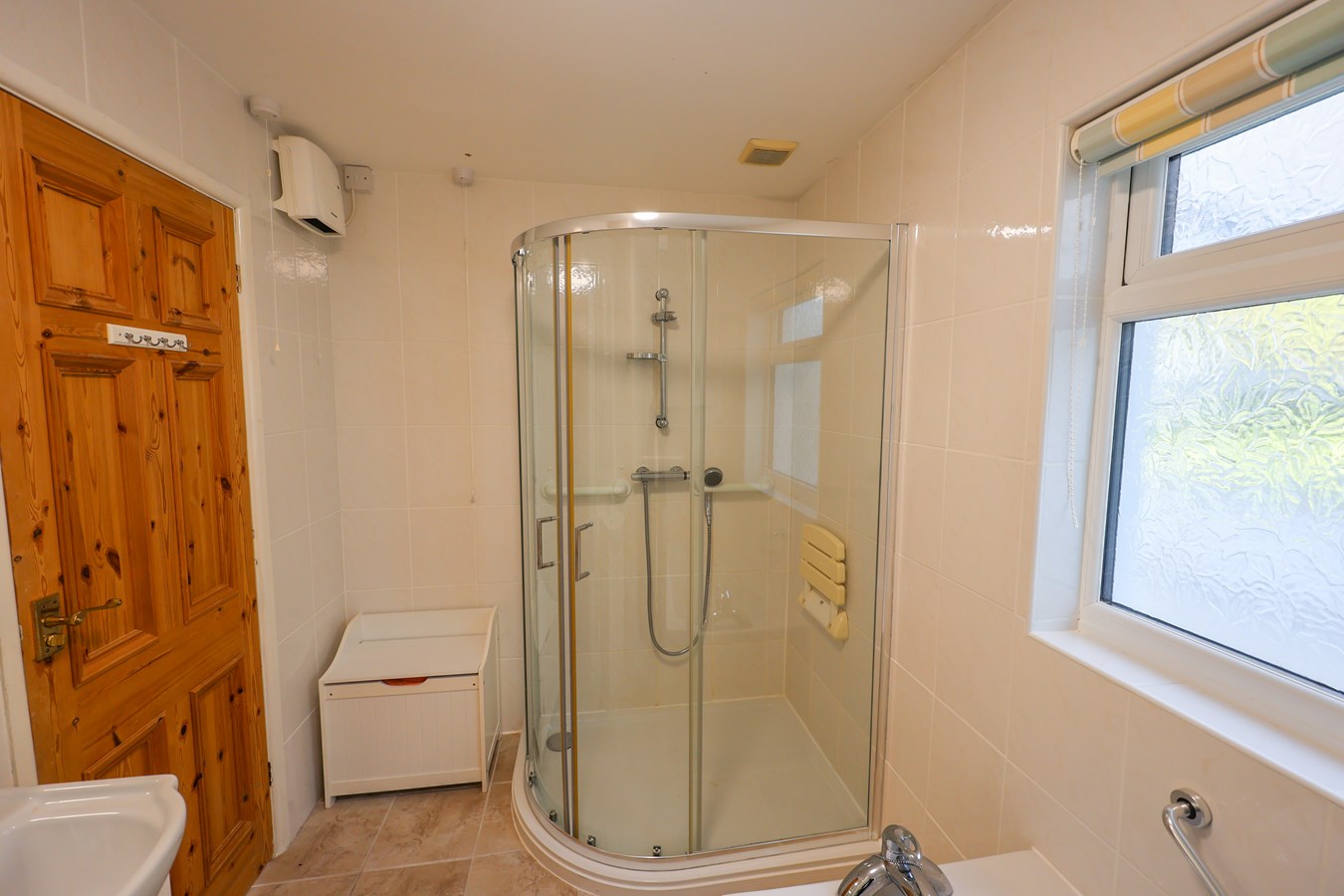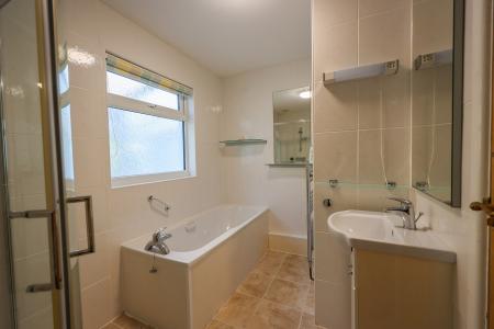 6' 3" x 9' 7" (1.91m x 2.92m) Window to the rear, ceramic tiled floor, fitted with vanity unit with cupboards below, shaver socket, fully tiled walls with a dimplex downflow heater, towel radiator, larger corner shower unit with mains shower, panelled bath, extractor fan.
