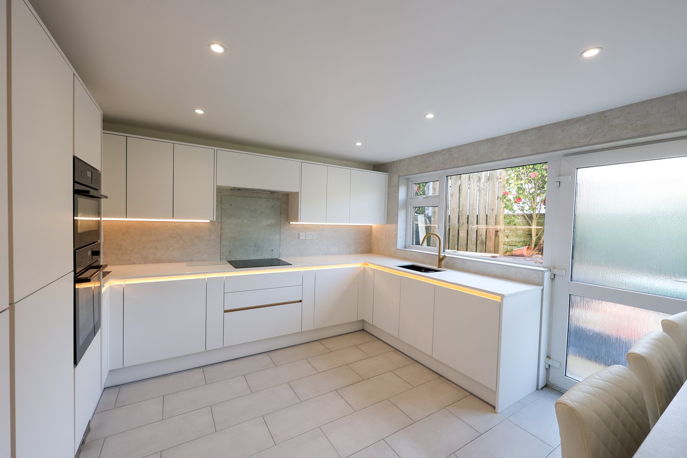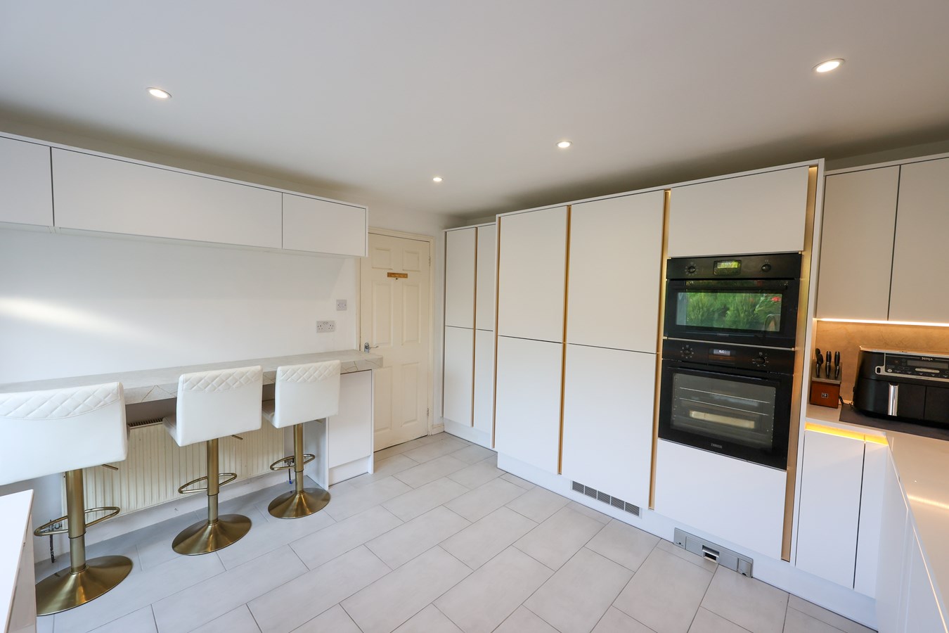 3.65m x 3.78m (12' 0" x 12' 5") Completely refitted in the last twelve months with a comprehensive range a Satin white fronted units incorporating, Gold trimmed inserts adding a touch of colour, built in fridge and freezer, large capacity storage cupboards, Zanussi electric oven with built in microwave an induction hob unit with glass splashback, concealed extractor, AEG integral dish washer. This is all topped with a White quartz work surface adding to that pristine look! Window to the front, full glazed door to the front. Breakfast bar with cupboards either side, recessed lighting, ceramic tiled floor.