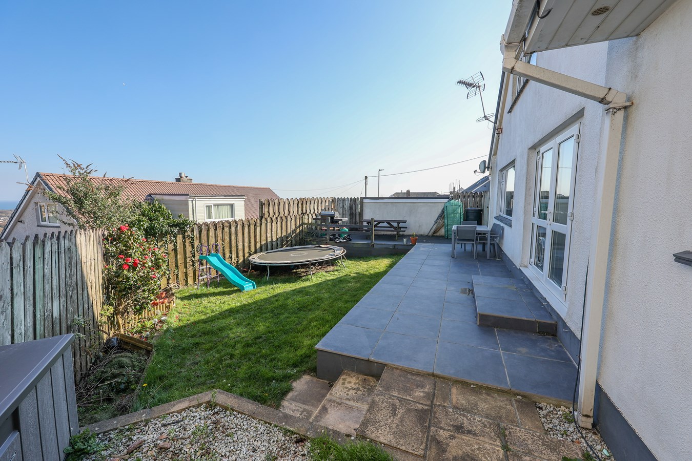At the rear, you'll find a charming slate stone patio, ideal for relaxing or entertaining, with steps leading up to a well-maintained lawn. Additionally, a timber decked area to the side adds further versatility to the outdoor spaces. This home combines practicality with appealing outdoor features, creating an excellent environment for modern living.