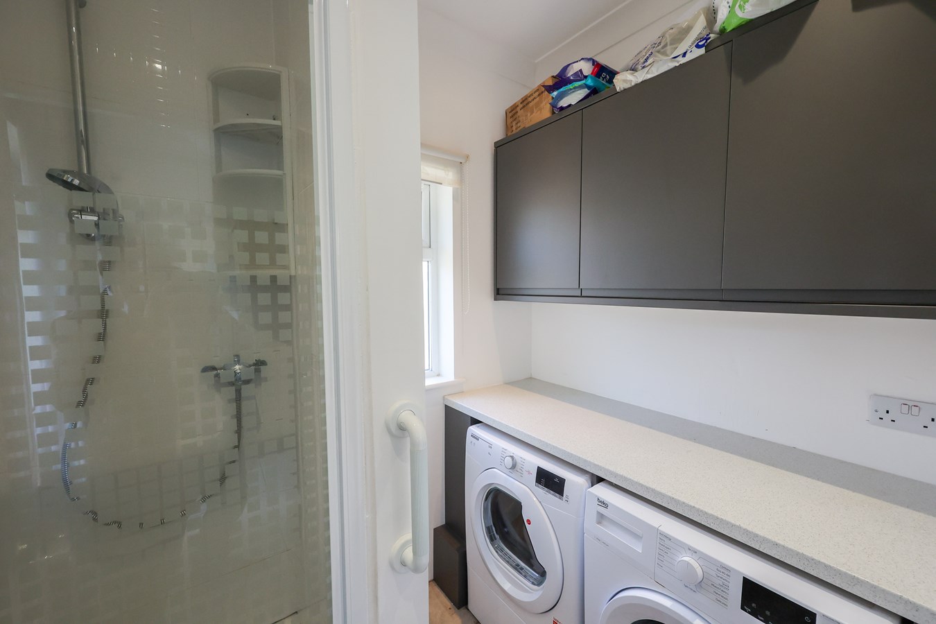 0.799m x 1.8m (2' 7" x 5' 11") With a fully tiled shower cubicle with a mains shower, extractor above, worktop with space below for washing machine and space for tumble dryer.