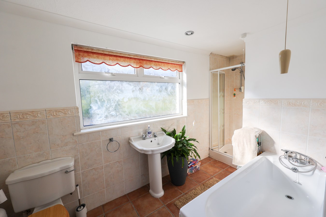 3.04m x 1.8m (10' 0" x 5' 11") This stylish bathroom boasts a large window to the front, filling the space with natural light. The ceramic tiled floor adds a sleek and durable touch, while the partially tiled walls enhance both practicality and aesthetics. The suite includes a panelled bath with a shower mixer attachment, a low-level W.C., and a wash hand basin, ensuring functionality and comfort. A recessed shower cubicle with a mains-powered shower provides a modern and convenient feature, complemented by recessed lighting that adds a contemporary finish.
