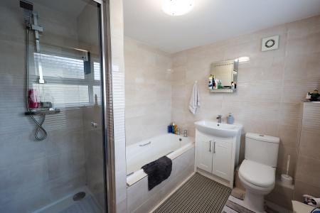 8' 6" x 7' 1" (2.59m x 2.16m) A well fitted room with attractive tiled walls, window to the side, fitted with a modern White suite comprising of a panelled bath, vanity basin with storage below, low level W.C. separate shower cubicle.
