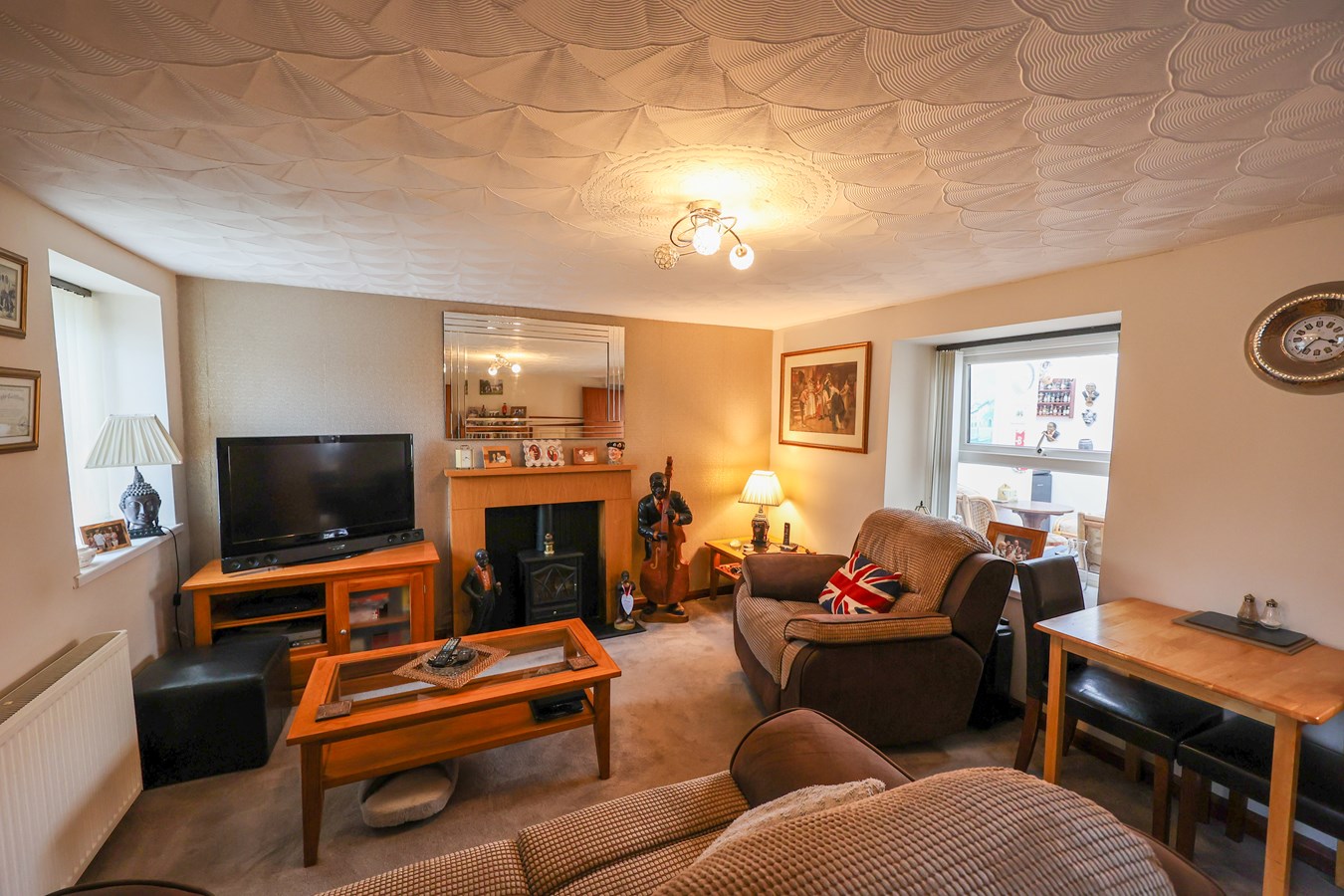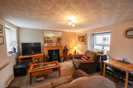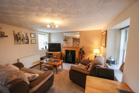 14' 3" x 12' 5" (4.34m x 3.78m) with window to the front and rear, doorway leading through to the kitchen, an attractive fireplace with wooden surround and wood burner inset