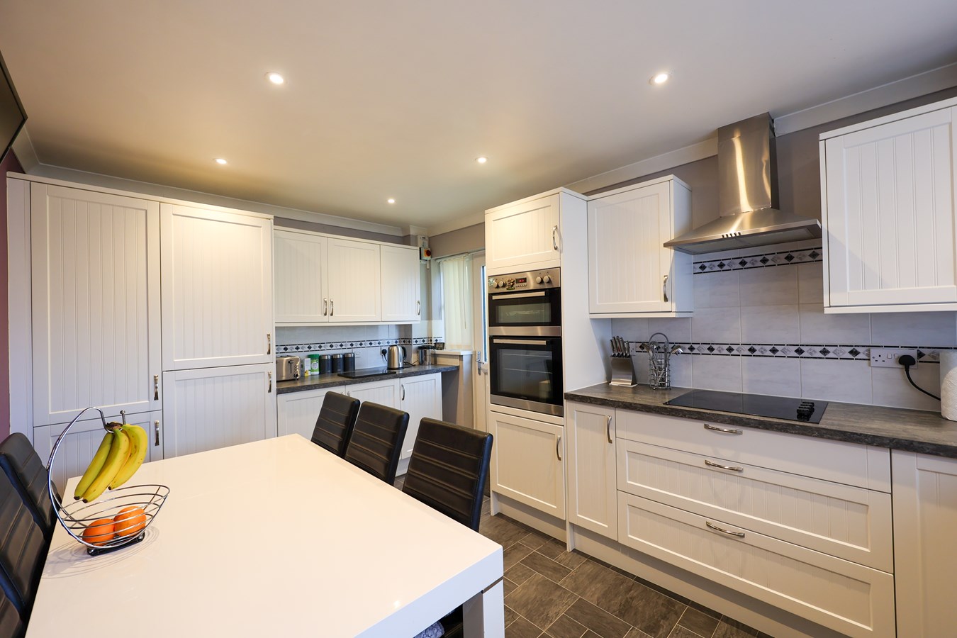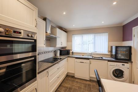 11' 3" x 17' 6" (3.43m x 5.33m) Window to the front and side and part glazed door to the side, sink unit with space and plumbing below for a dishwasher and separate space for a washing machine, fitted hob unit with stainless streel extractor over, double electric oven, built in fridge/freezer, tall larder storage unit. Low voltage lighting, wall mounted socket for T.V.