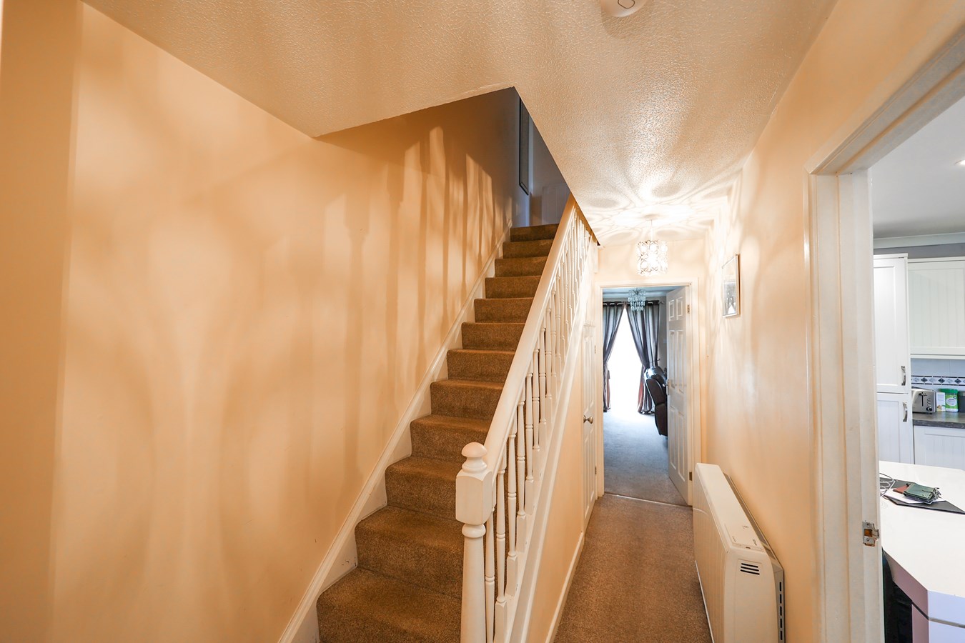With half glazed leaded light door leading to the entrance lobby, leading through there are stairs leading to the first floor with under stairs storage, Quantum electric room heater.