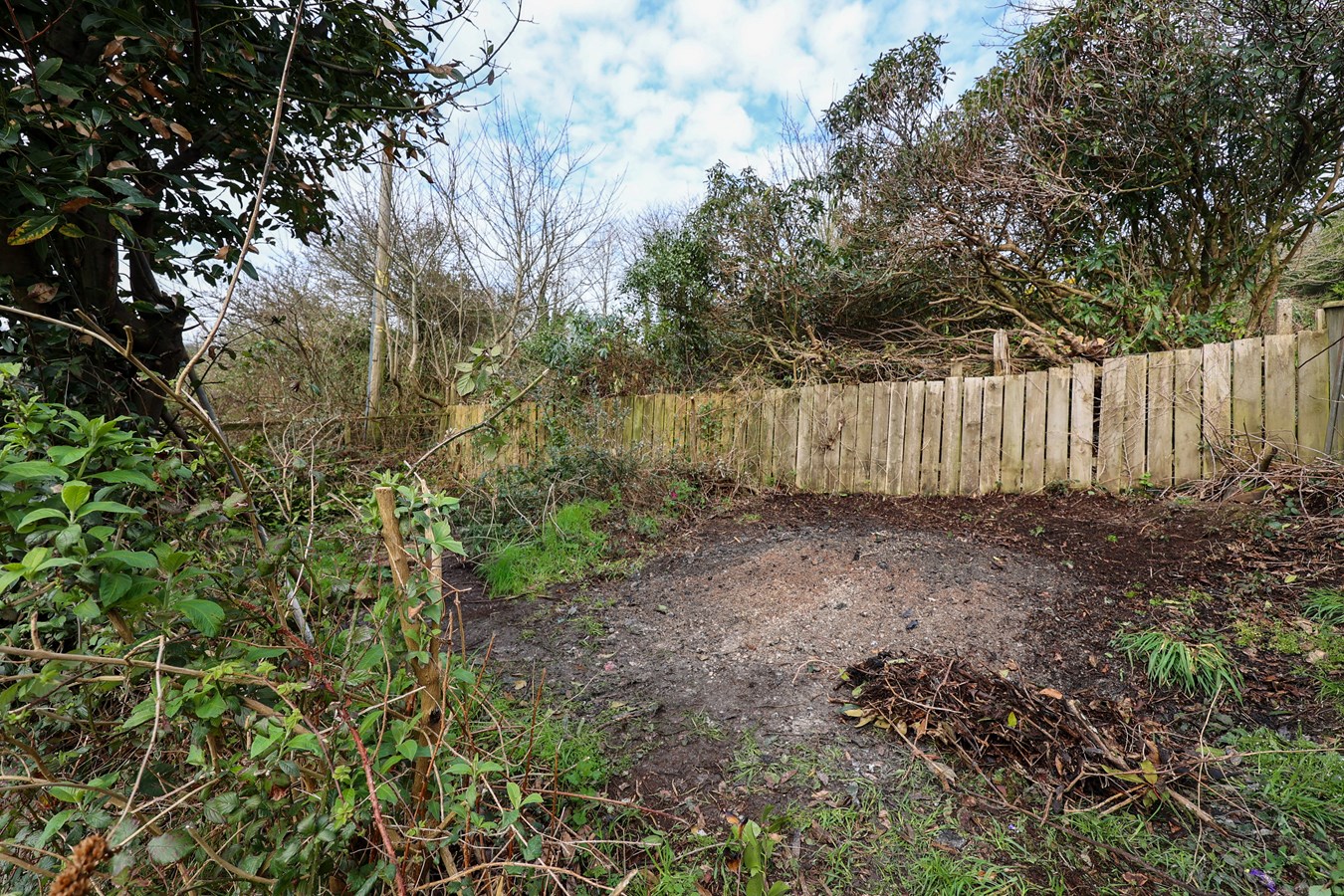 To the front, is a small lay-by area just before the driveway. The driveway widens on approach, offering ample space before continuing up to the garage positioned at the top.