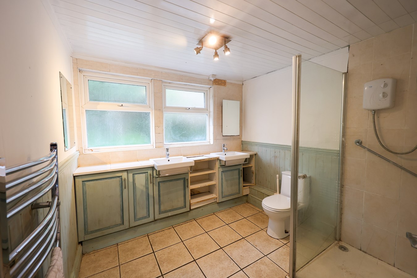 2.6m x 2.8m (8' 6" x 9' 2") With a ceramic tiled floor, T&G panelling to Dado height, vertical towel radiator, two built in sink units, low level W.C. shower cubicle with Triton Electric shower, two windows to the rear.