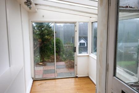 With glazed door and door leading to the kitchen/dining room, patio doors leading to the front patio area.