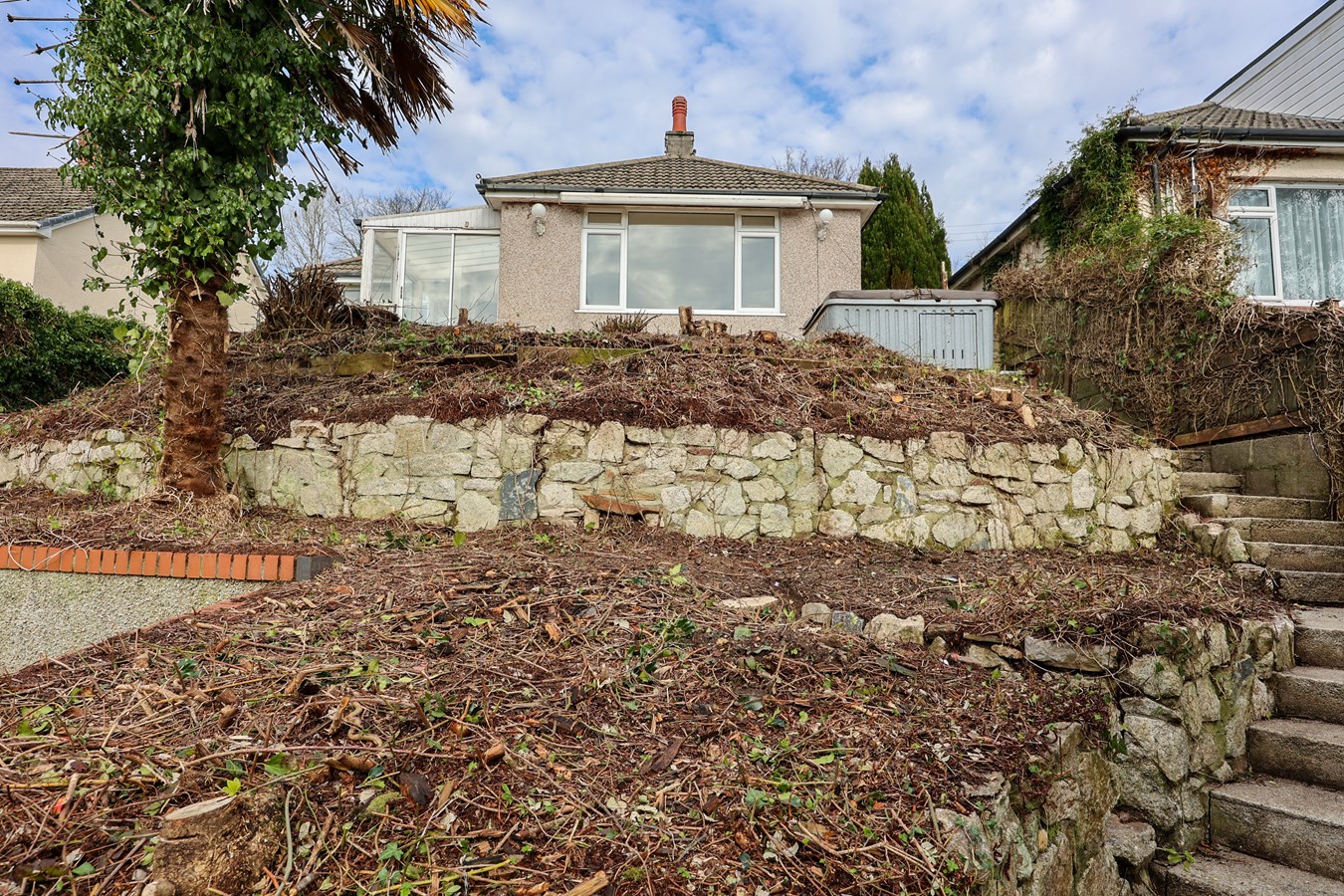 Steps rise from the lower driveway through the front garden to a paved patio seating area?perfect for enjoying the outlook. From here, a pathway runs along the right-hand side, giving access to the side kitchen door and continuing to the rear. A further short flight of steps leads up to the rear garden.