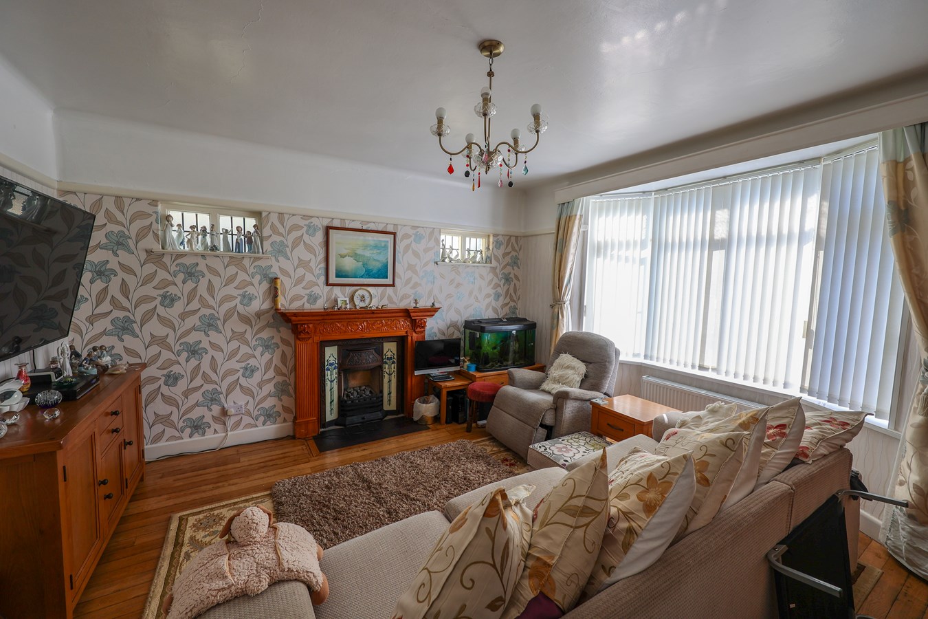 4.21m x 4.3m (13' 10" x 14' 1") The room is beautifully appointed with a small bay window at the front and two leaded light windows to the side, enhancing natural light and character. A striking open fireplace, framed by an ornate sculpted hardwood surround, features a registered-style grate. The hardwood stripe flooring complements the space, while a picture rail and two wall lights complete the refined aesthetic.
