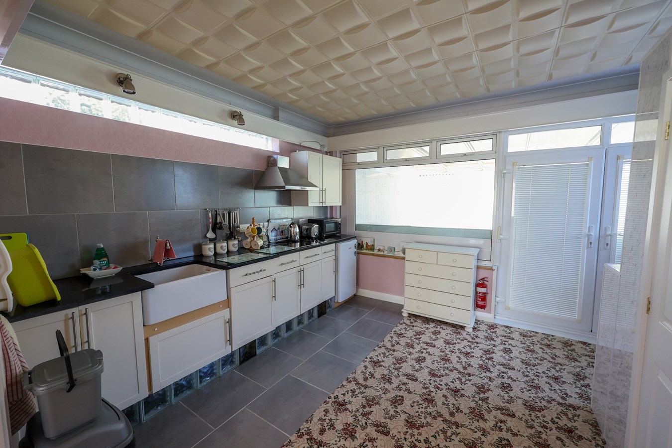 3.5m x 4.2m (11' 6" x 13' 9") Equipped with a range of base units, this kitchen features an enamel sink unit with a mixer tap, set into a solid granite worktop for a high-quality finish. A ceramic hob unit with an extractor above ensures practicality, while feature glass blocks along the side wall introduce additional natural light. Two downlighters enhance the ambiance, and French doors open seamlessly into the conservatory.