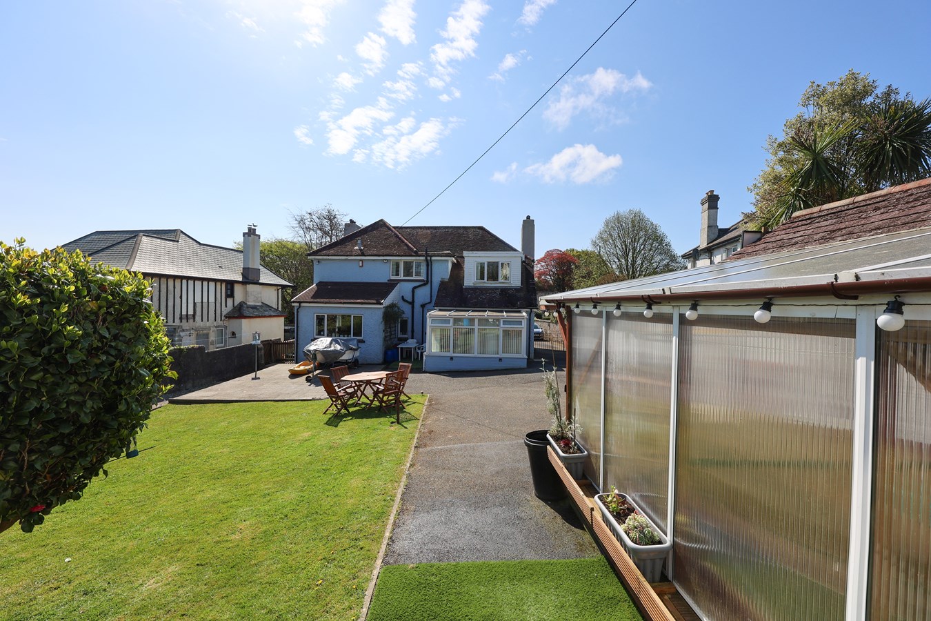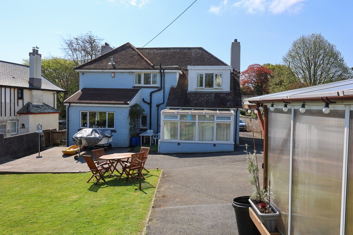 At the rear, an expansive lawned garden offers a generous outdoor space with direct access to the garage and studio. Additionally, two large aluminium greenhouses provide ideal growing conditions, while a further tarmac area accommodates extra parking, enhancing practicality.