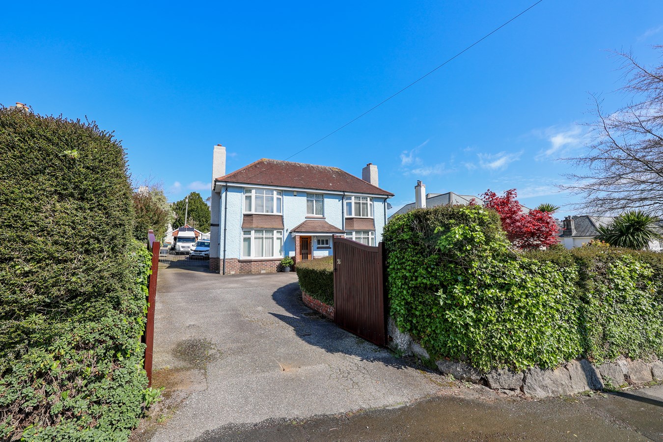 The property is accessed via a wooden gated entrance, leading to an extensive tarmac driveway with ample parking for multiple vehicles. The front border ensures excellent privacy, framing a formal lawn and a slightly sunken garden, enclosed by a brick wall and a lush shrub border for added character.