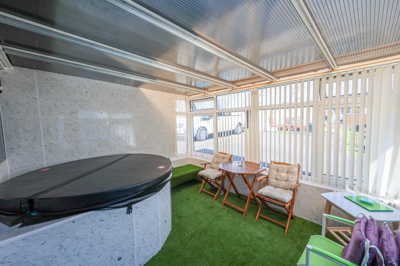 3.77m x 3.06m (12' 4" x 10' 0") Featuring a part-glazed composite door leading to the rear, this space is enhanced by a double-glazed tinted Perspex roof, creating a bright yet private atmosphere. A built-in hot tub adds a luxurious touch, perfect for relaxation.
