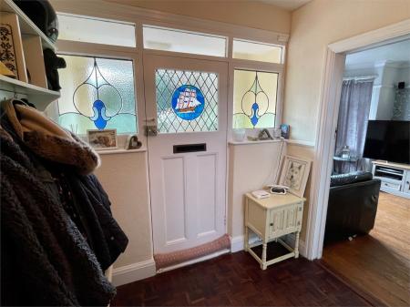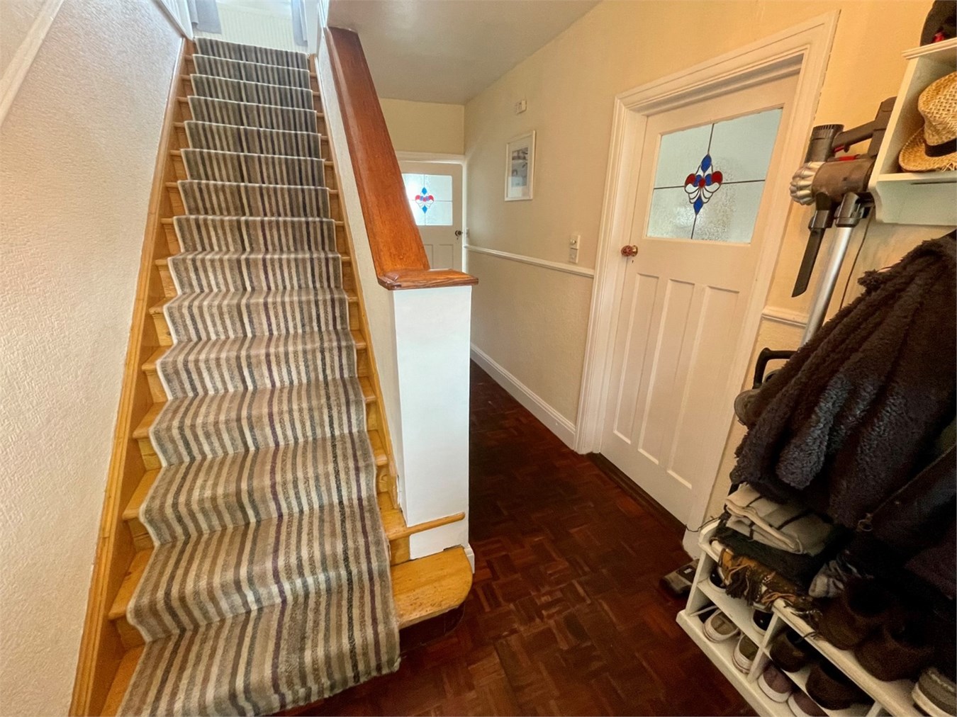 An impressive entrance hall with a wide staircase to the first floor, dado rail, radiator, stained glass front entrance door and surround, parkay flooring.