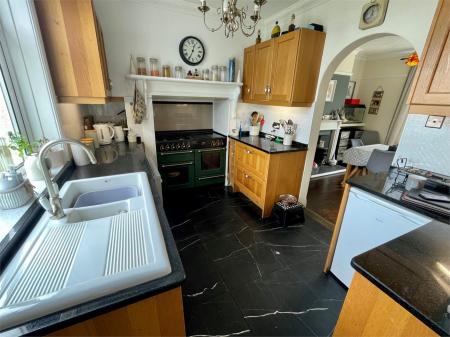 10' 4" x 8' 1" (3.15m x 2.46m) Fitted with a range of wall, base and drawer units with granite work surface over, inset sink and drainer unit, plumbing for dish washer, space for fridge, gas fired range oven, upvc window to rear, heated towel rail. opening into