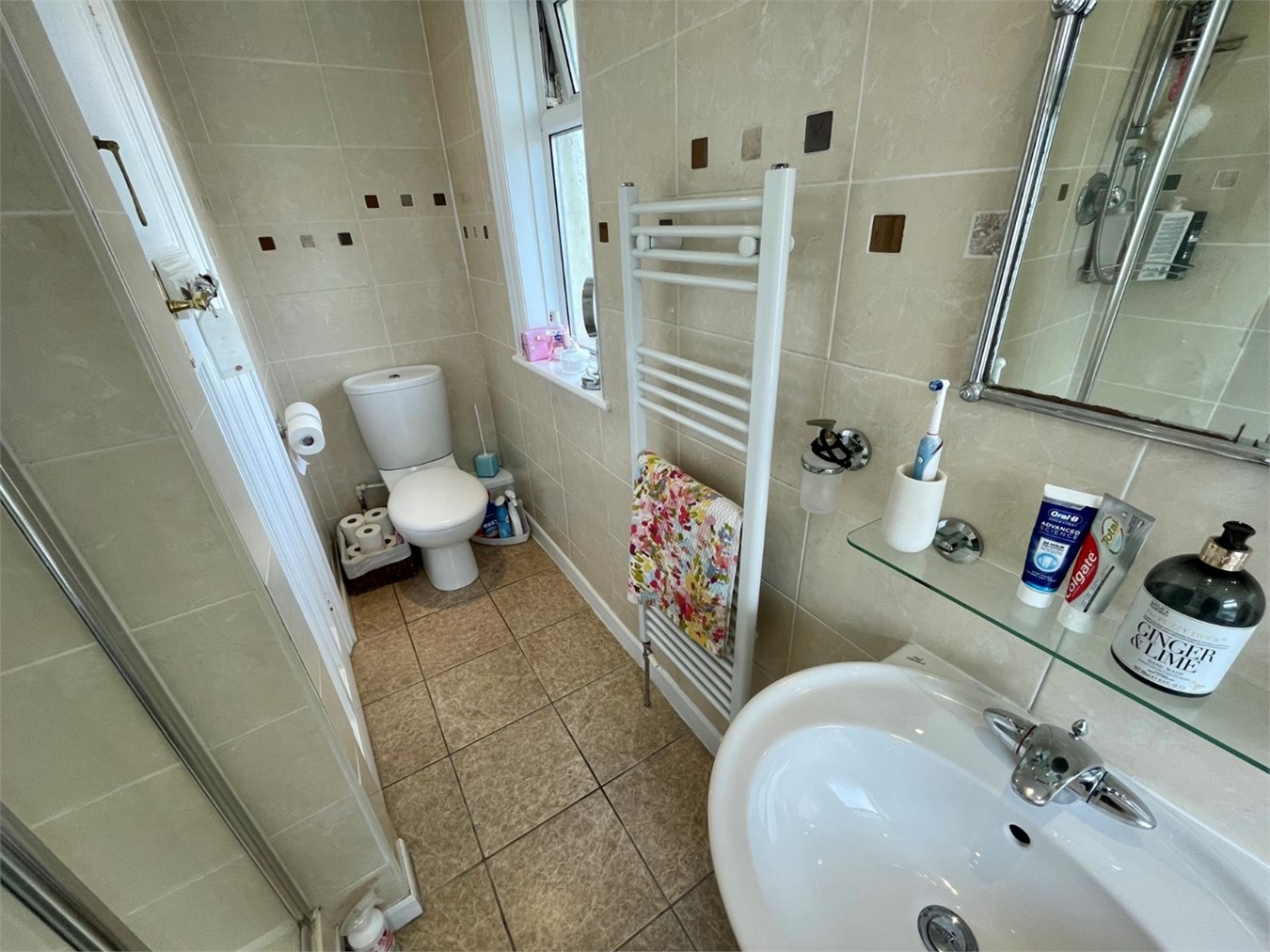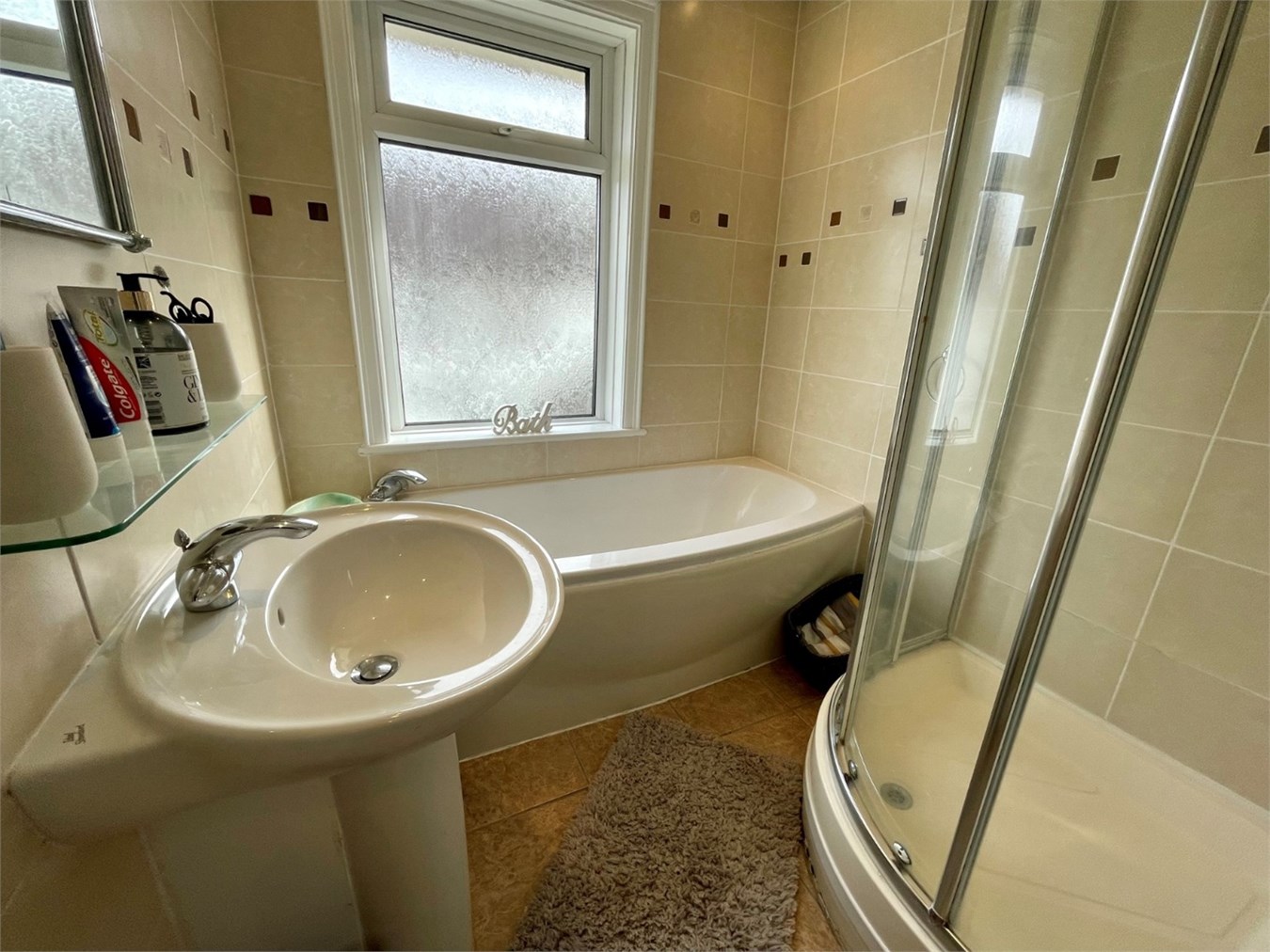 An L-shaped room with Low level WC, wash hand basin, corner shower cubical with glass surround, panel bath, tiled walls and floor, upvc windows to rear and side, heated towel rail.