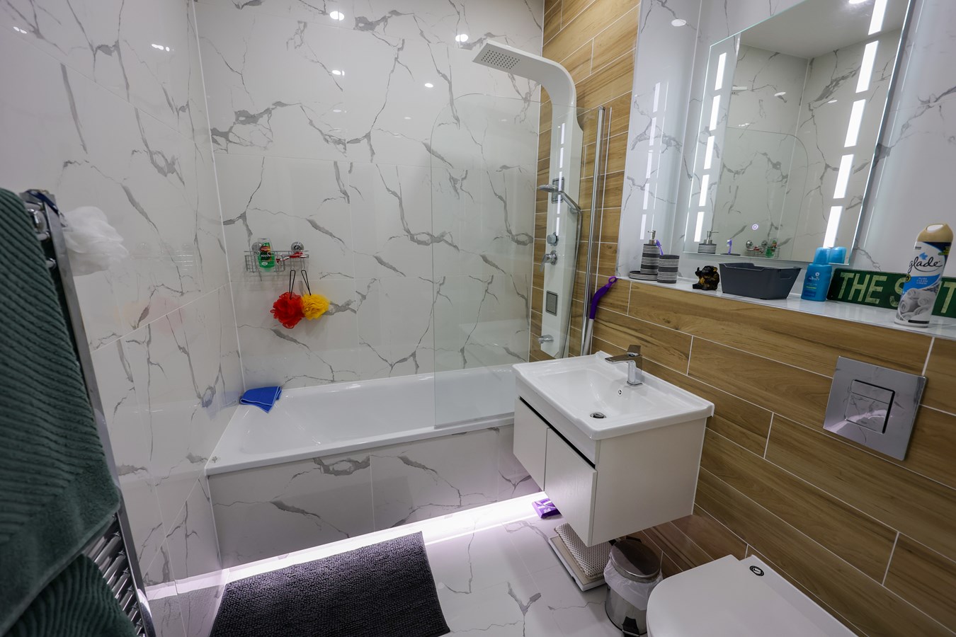 2.1m x 1.98m (6' 11" x 6' 6") A fully featured bathroom with excellent fitted and selection of bespoke tiled floor and walls comprising of a concealed cistern low level W.C. panelled bath with feature plinth lighting, wall mounted vanity basin with storage, electric wall mounted illuminated mirror, towel radiator, a shower console situated over the bath with body jets and two shower heads.