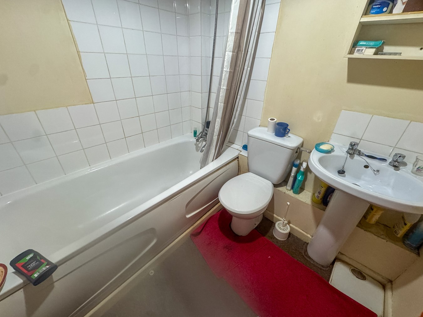 6' 4" x 5' 9" (1.93m x 1.75m) Fitted with a White suite comprising of a panelled bath with shower mixer attachment, low level W.C. wash hand basin.