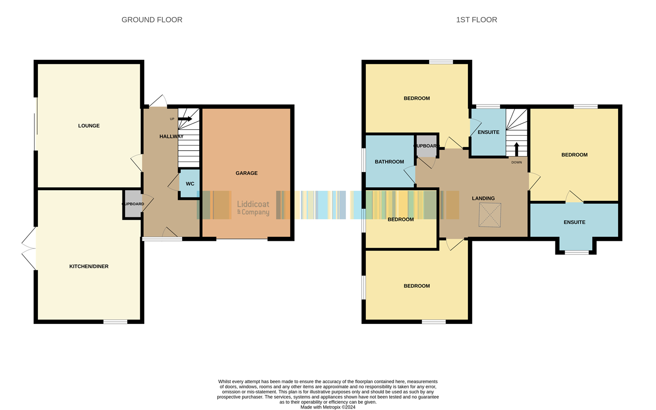 The spacious layout includes an entrance hall, cloakroom, lounge, large kitchen/dining room with sliding patio doors, integral garage, four bedrooms, two en-suite bathrooms, and a main bathroom. Outside, there’s private parking and lawned gardens.
