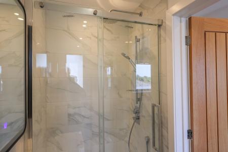 Premium features include oak-finished internal doors, low-voltage lighting, UPVC double-glazed windows and doors, air source heating, and a full suite of built-in Bosch kitchen appliances including a double oven, induction hob, extractor, fridge, and freezer. Bathrooms and en-suites are partially tiled for a sleek finish, and the tarmac driveway adds a practical touch. No chain, no delay.