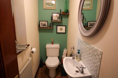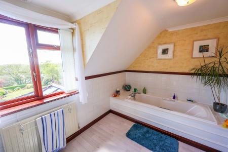 3.65m x 2.33m (12' 0" x 7' 8") A front-facing window fills the space with natural light, while half-tiled walls to dado height add a stylish touch. The four-piece suite includes an enclosed panelled bath with shower mixer attachment, low-level W.C., wash hand basin, and bidet, offering both comfort and functionality.