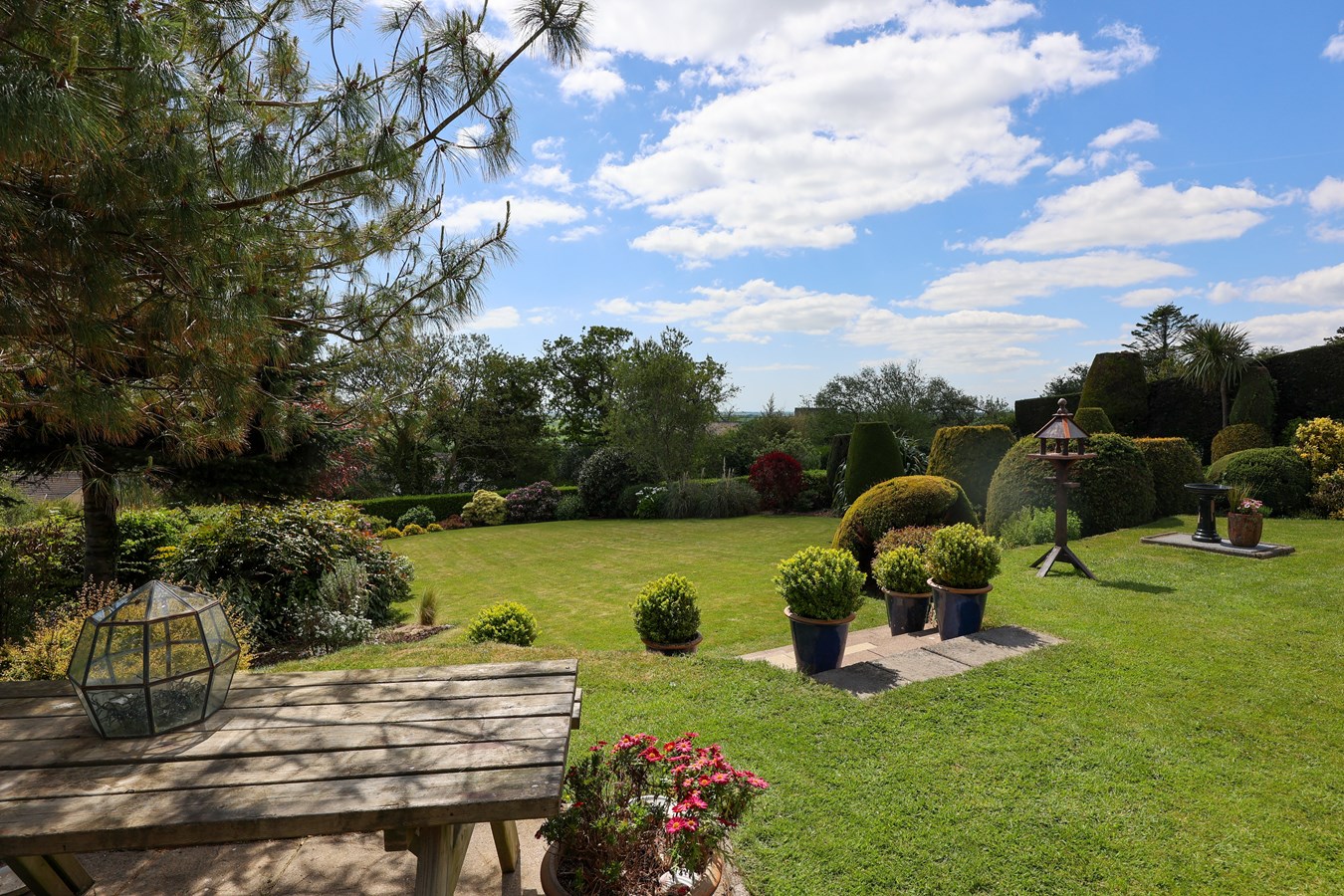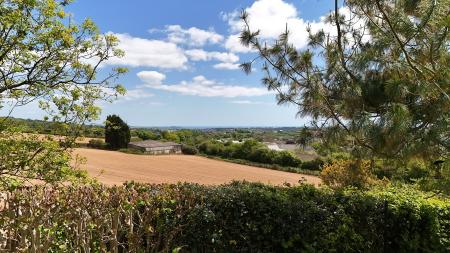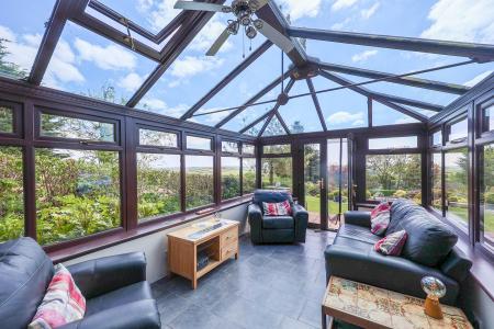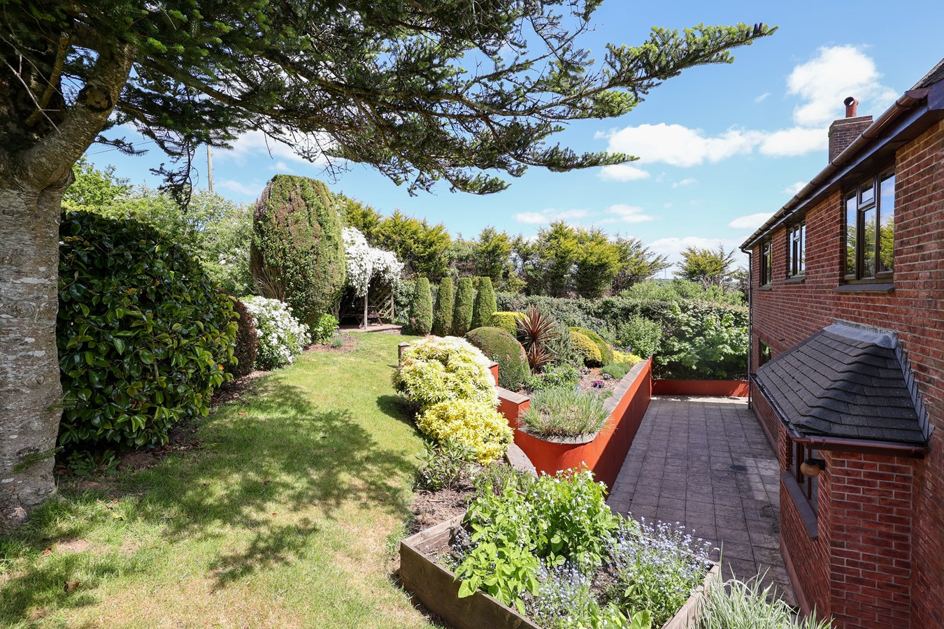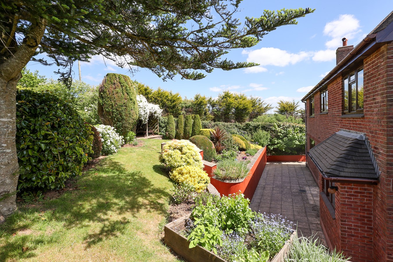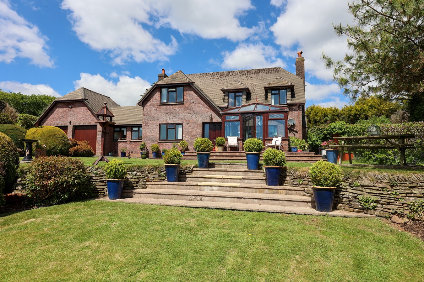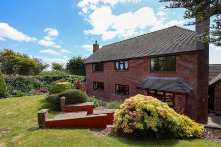 A patio off the conservatory offers a stunning vantage point to soak in the glorious views, while a paved walkway extends around to the rear, where steps lead to a raised lawn garden surrounded by lush greenery, raised beds and a further secluded raised garden patio. The property benefits from views over a paddock to the rear and open fields to the right.