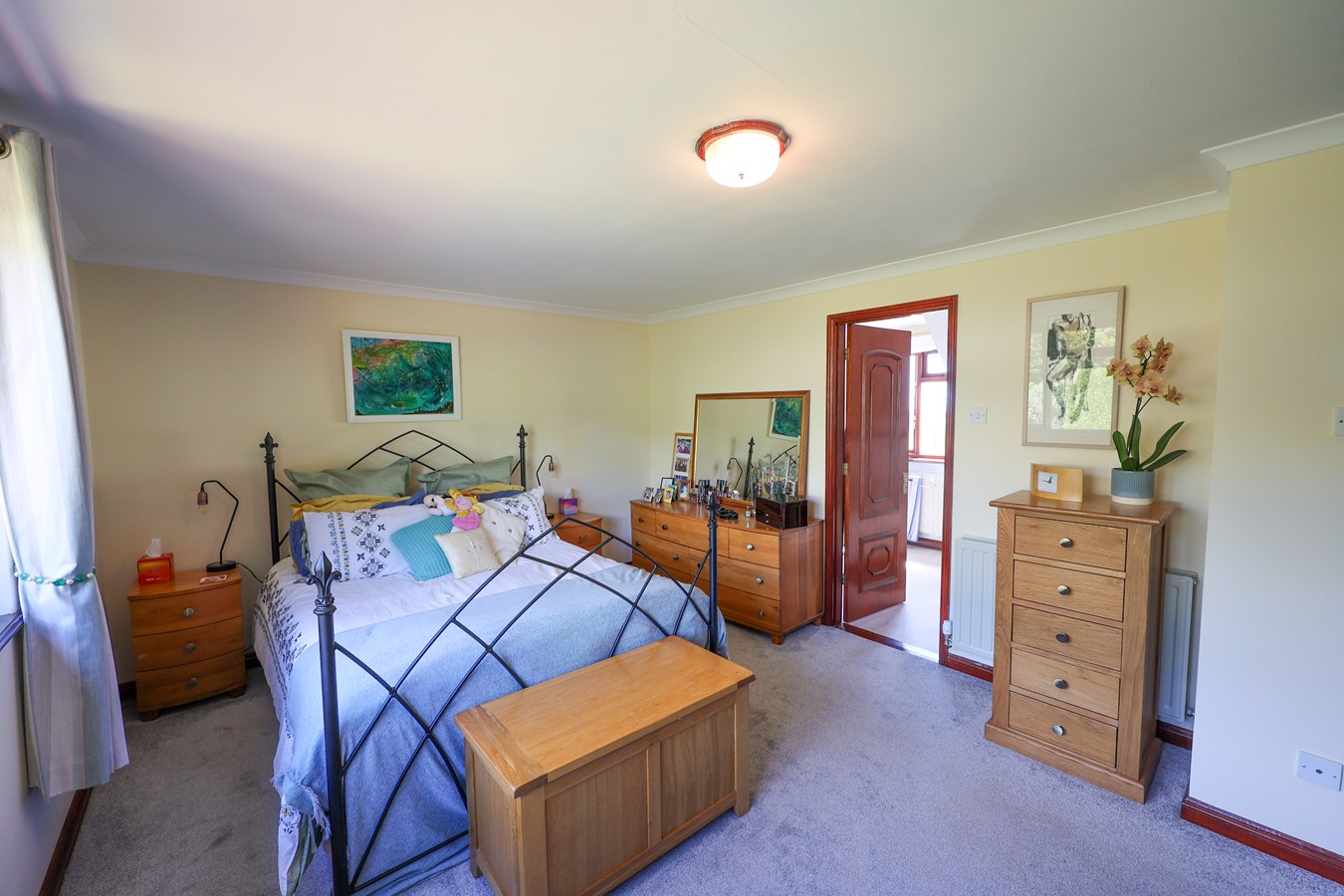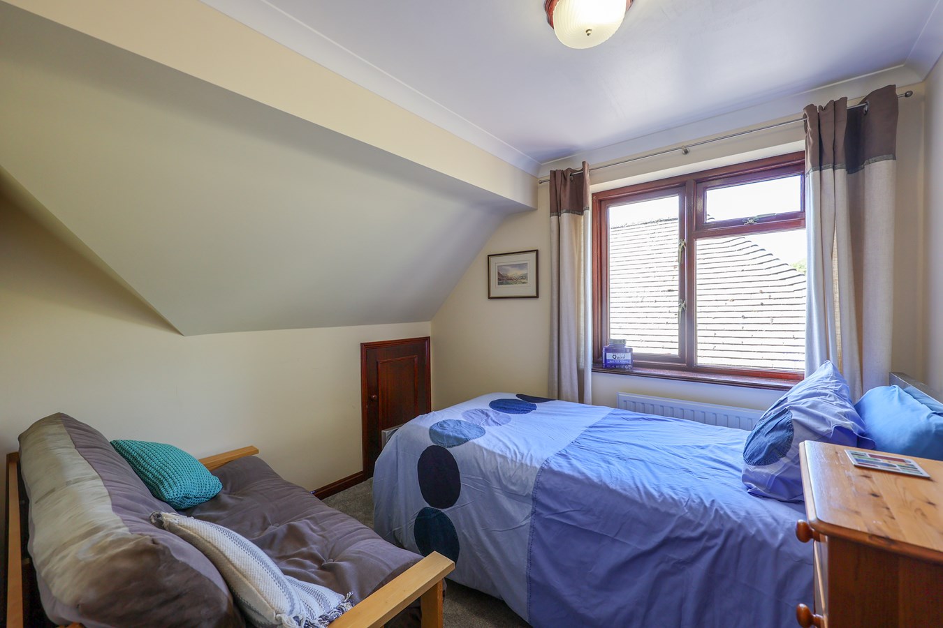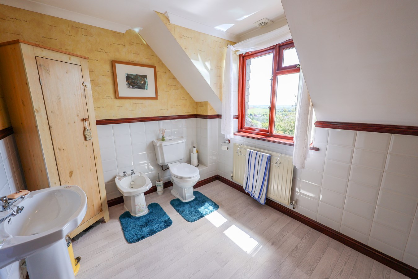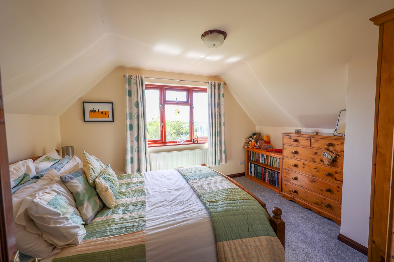 A dormer window at the front captures panoramic views, stretching for miles in both Easterly and Westerly directions. A built-in airing cupboard with shelving adds practical storage to the space.