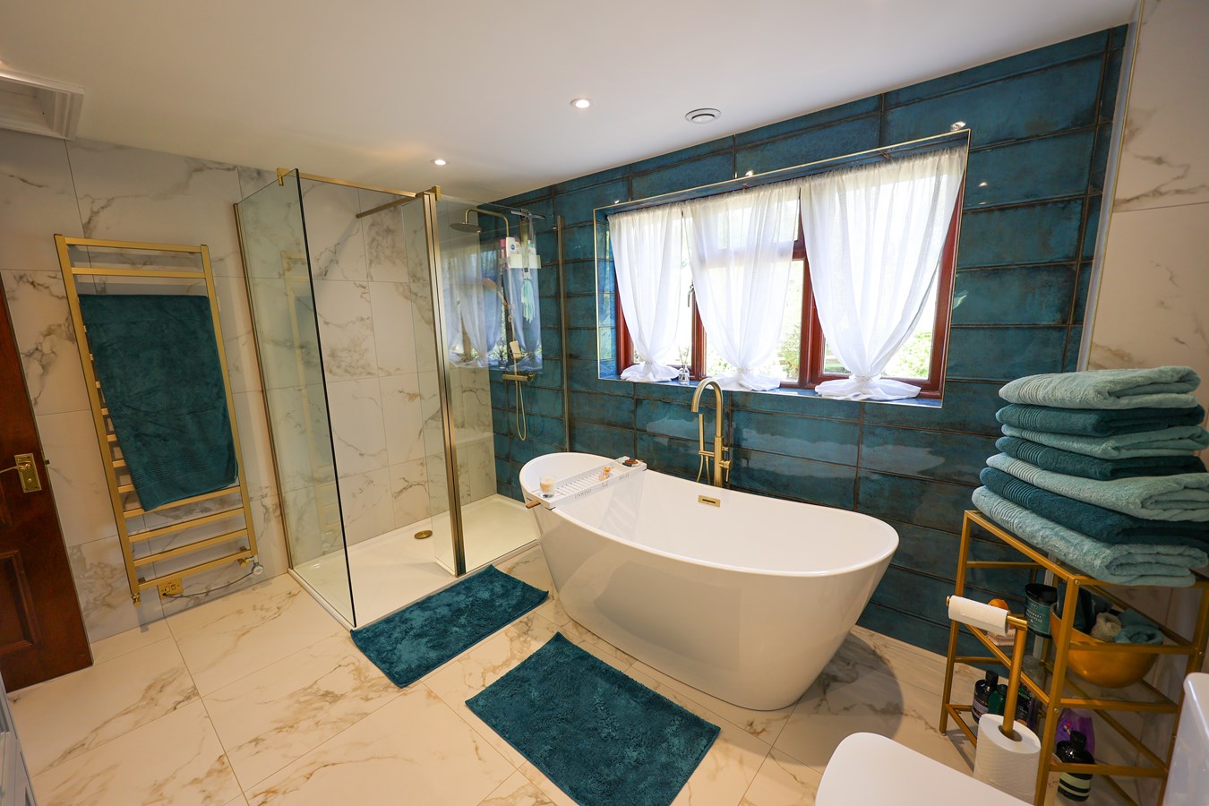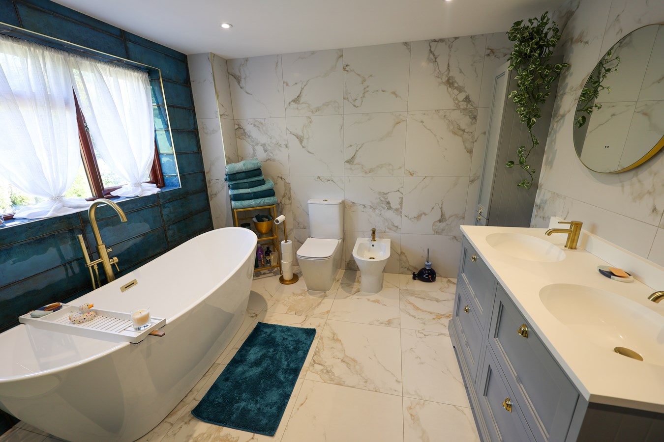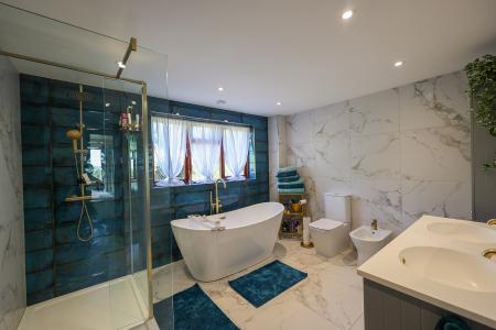 3.51m x 2.95m (11' 6" x 9' 8") A spacious and elegantly finished bathroom featuring fully tiled floors and walls. Also benefiting from under floor heating. A standalone sculpted bath takes centre stage, complemented by a floor-mounted water supply with an attached shower head. The separate shower cubicle, finished in brushed brass, boasts twin mains-powered shower heads for a luxurious experience. A his-and-hers twin basin vanity unit with storage below adds both practicality.