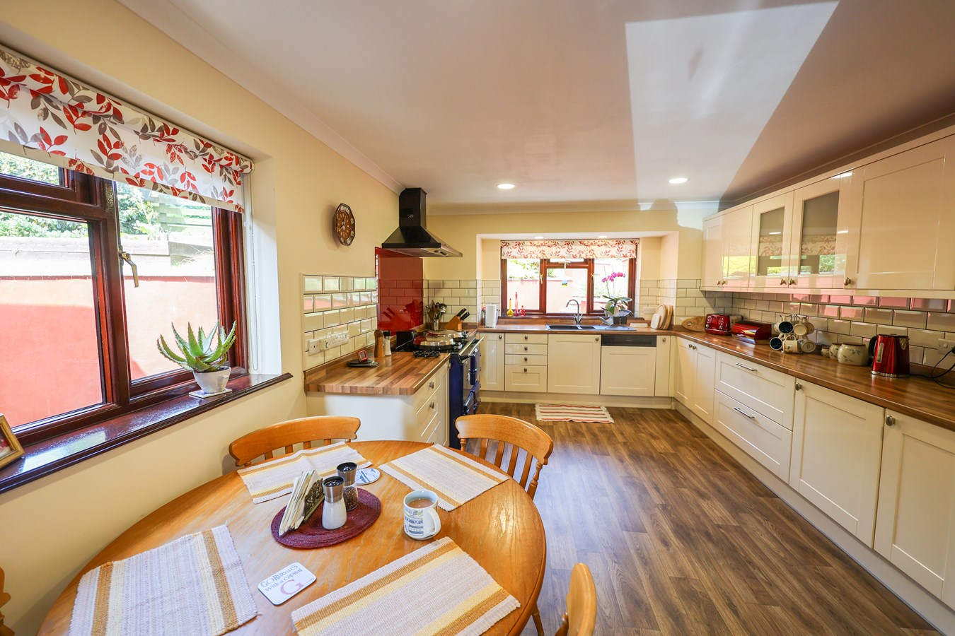 4.88m x 3.4m (16' 0" x 11' 2") Featuring an attractive wood-effect vinyl floor, this stylish kitchen is equipped with an oil-fired Aga supplying hot water. A comprehensive range of high-gloss units is complemented by butcher's block wood-effect work surfaces, large pull-out larder storage, and recessed lighting. Windows to the side and rear enhance natural light, while a ceramic hob, electric oven, built-in dishwasher, and larder fridge offer modern convenience. A tiled splashback adds a polished finish, with a door leading to the utility room for added practicality.