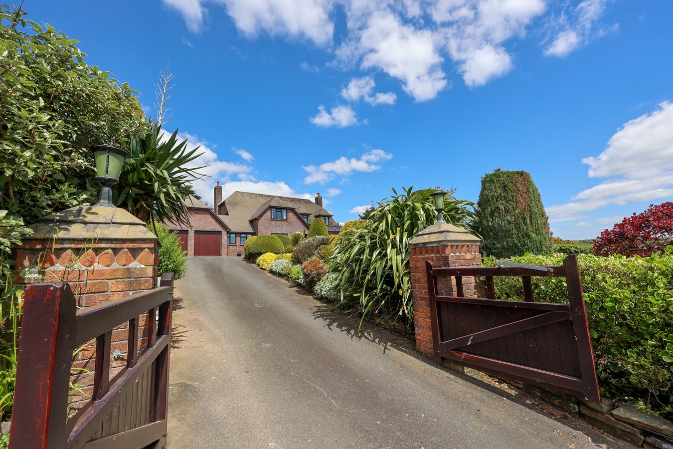 Hanjague is accessed via a private road, leading from the main road to an impressive gated entrance and sweeping tarmac driveway. The mature landscaped gardens showcase tiered formal lawns, sculpted shrubs, and a beautifully curated outdoor space.