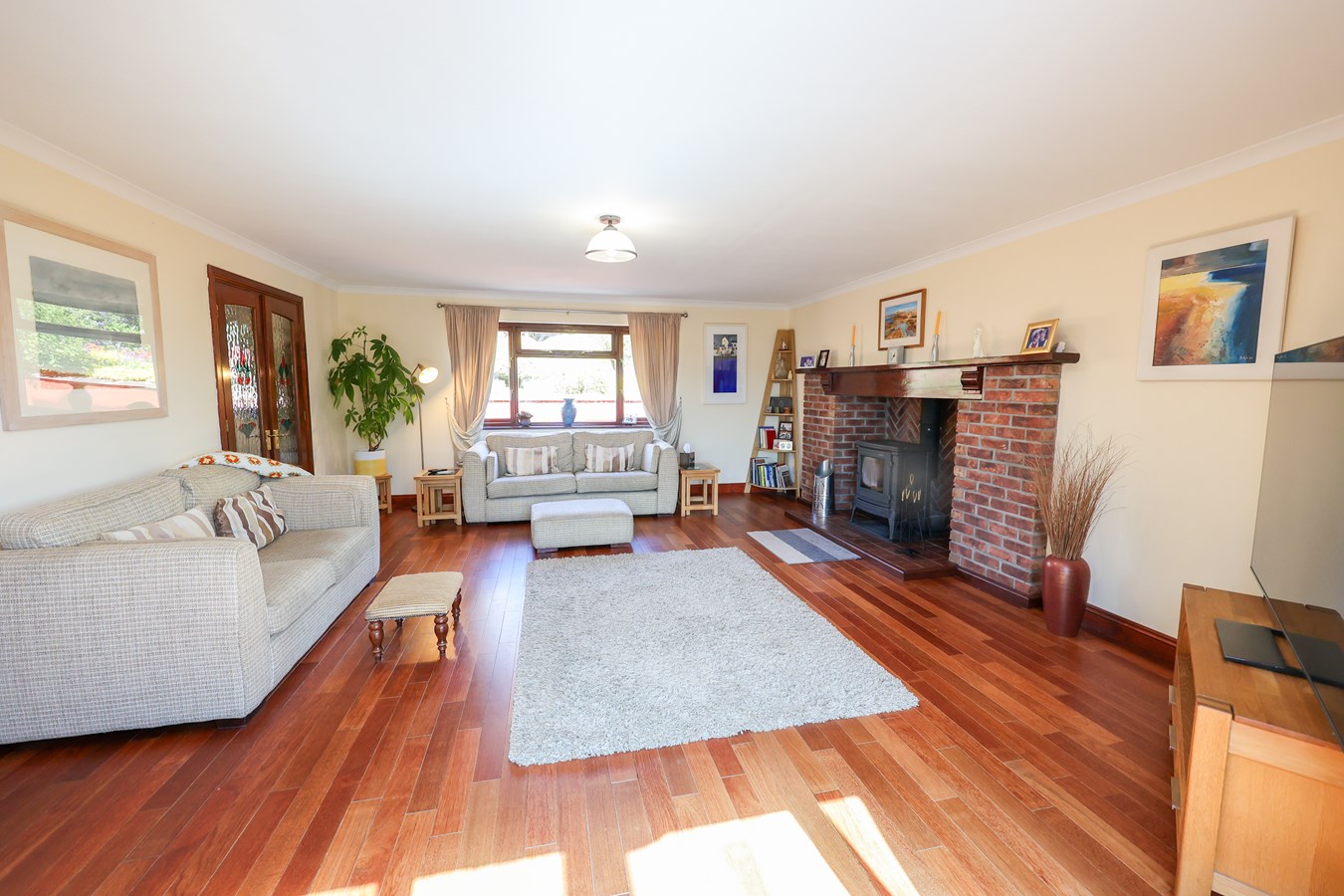 4.97m x 5.96m (16' 4" x 19' 7") Showcasing a hardwood floor and a deep-set farmhouse-style brick herringbone fireplace with a log burner inset. A clay tiled floor and large wooden mantel enhance its rustic charm, while a rear-facing window fills the room with natural light. French doors elegantly connect it to the dining room, creating a seamless flow for entertaining and everyday living.
