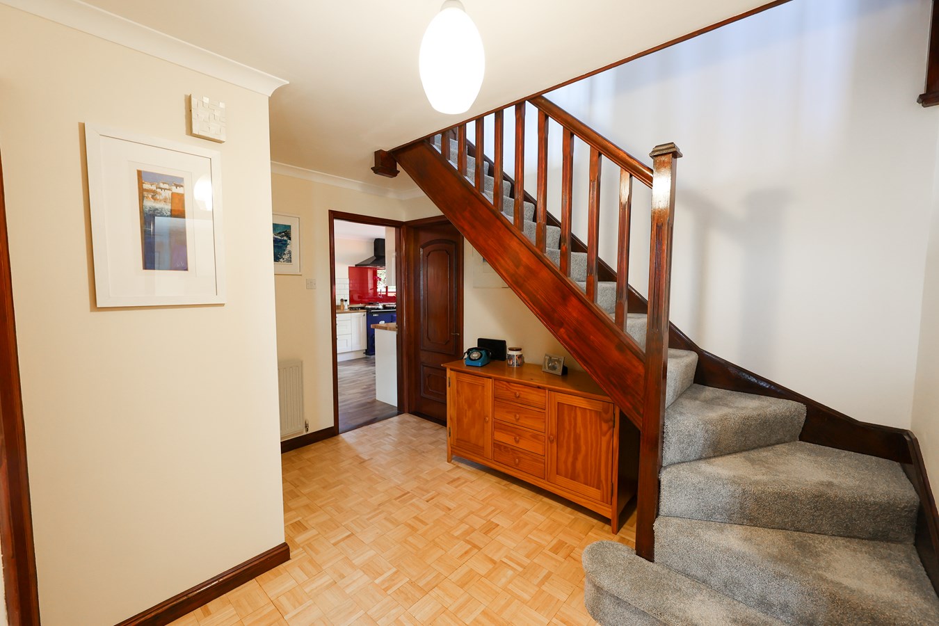 3.53m x 2.62m (11' 7" x 8' 7") Featuring a parquet wood block floor, this space exudes warmth and character, seamlessly leading to the stairs ascending to the first floor.