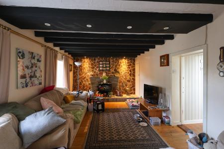 3.34m x 9.46m (10' 11" x 31' 0") This room exudes character, featuring an open-beamed ceiling and a raised natural slate fireplace with plinth lighting. A bay window to the front and two additional windows allow natural light to pour in. Thoughtfully designed with a fitted storage cupboard, the space also benefits from a night storage heater. A small-paned door leads into the dining room, while a display shelf with arched pillar features adds charm.