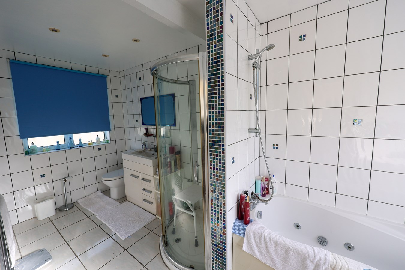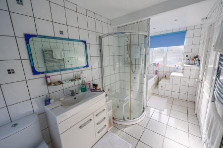 4.7m x 1.882m (15' 5" x 6' 2") Featuring windows to both the front and rear. The walls are fully tiled and there is convenient built-in storage including an airing cupboard and storage cupboard. The vanity unit provides further storage, and the bathroom is complete with a low-level W.C., a panelled bath with a shower mixer attachment, and a separate shower cubicle. A towel radiator provides warmth.