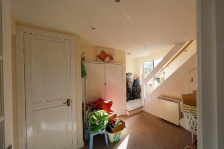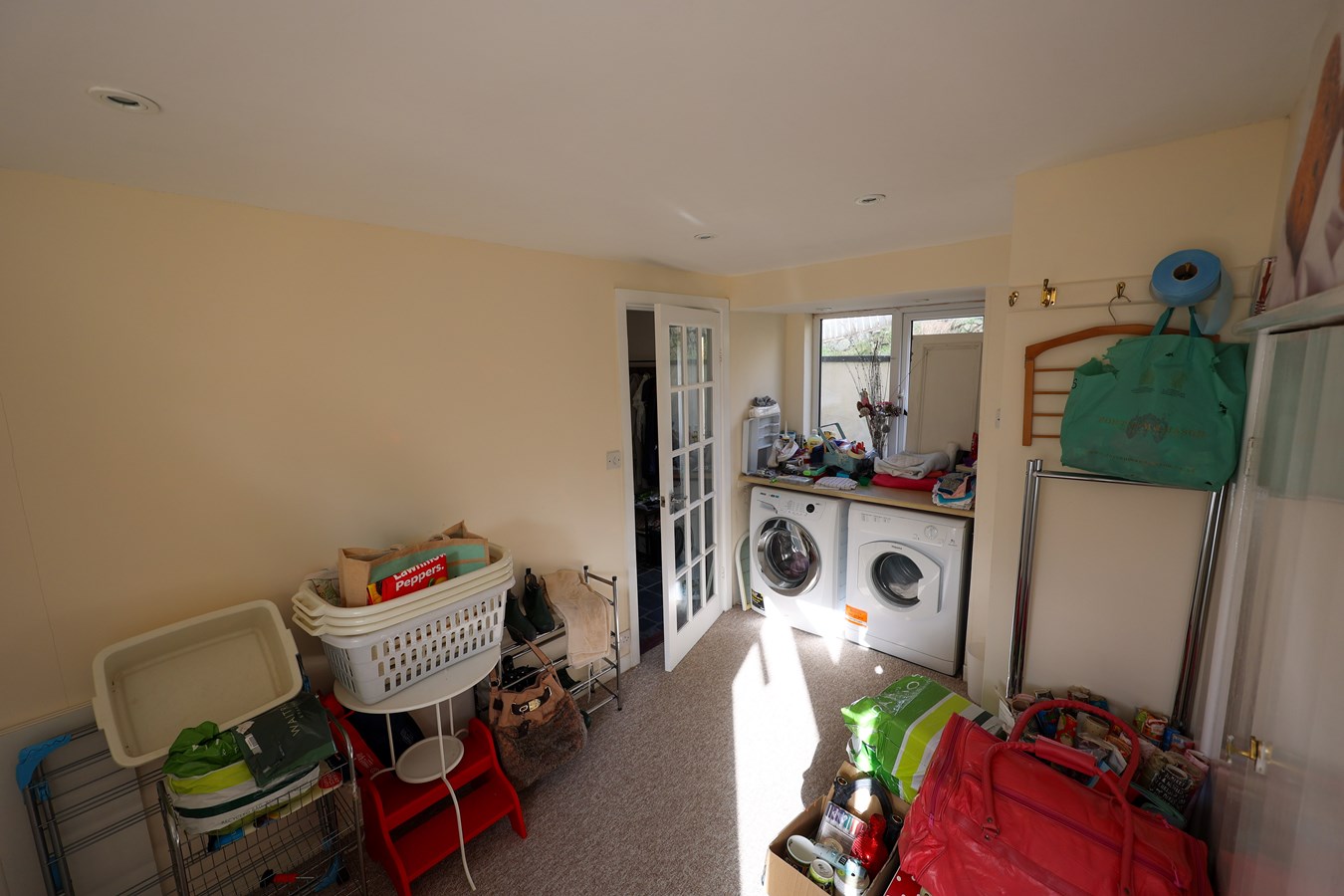 4.72m x 3.18m (15' 6" x 10' 5") This utility room is practical and spacious, featuring windows to the front and rear. A generous worktop provides ample space, with room below for a washing machine and tumble dryer. Additional storage includes a two built in cupboards, one currently housing a chest freezer. The space is enhanced by modern low-voltage lighting, a night storage heater and stairs leading to the first floor with a useful under-stair cupboard. A door leads to the cloakroom, which is fitted with a low-level W.C., a wash hand basin, and a rear window.