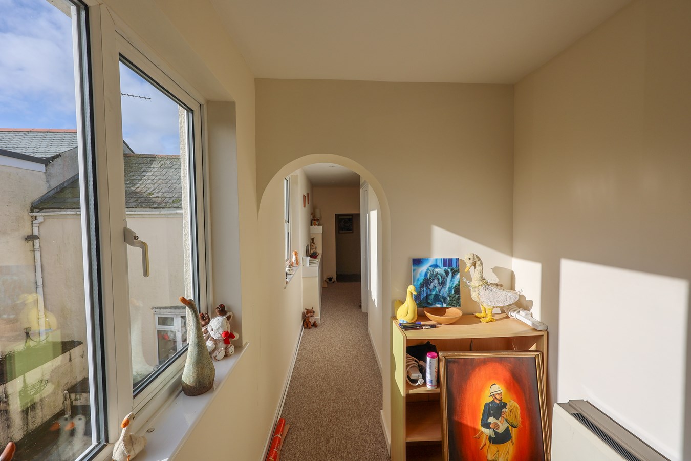 The landing is filled with natural light, featuring two windows that overlook the front courtyard. A night storage heater ensures warmth and comfort.