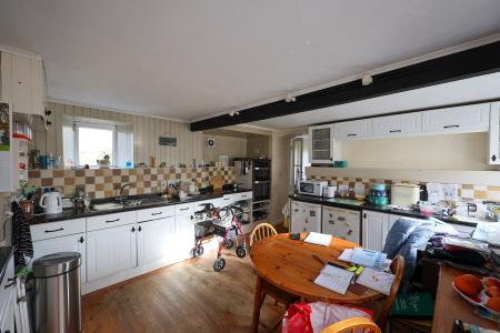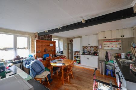 4.72m x 4.297m (15' 6" x 14' 1") Well fitted with a range of White fronted units and granite effect work tops, It features a Belling eye-level double oven, a ceramic hob, and an extractor fan, perfect for effortless cooking. A secondary worktop provides additional space, with room for a washing machine and fridge. Natural light floods the space through two front-facing windows, while the wooden flooring adds warmth and character. A stable door leads seamlessly into the main living room.