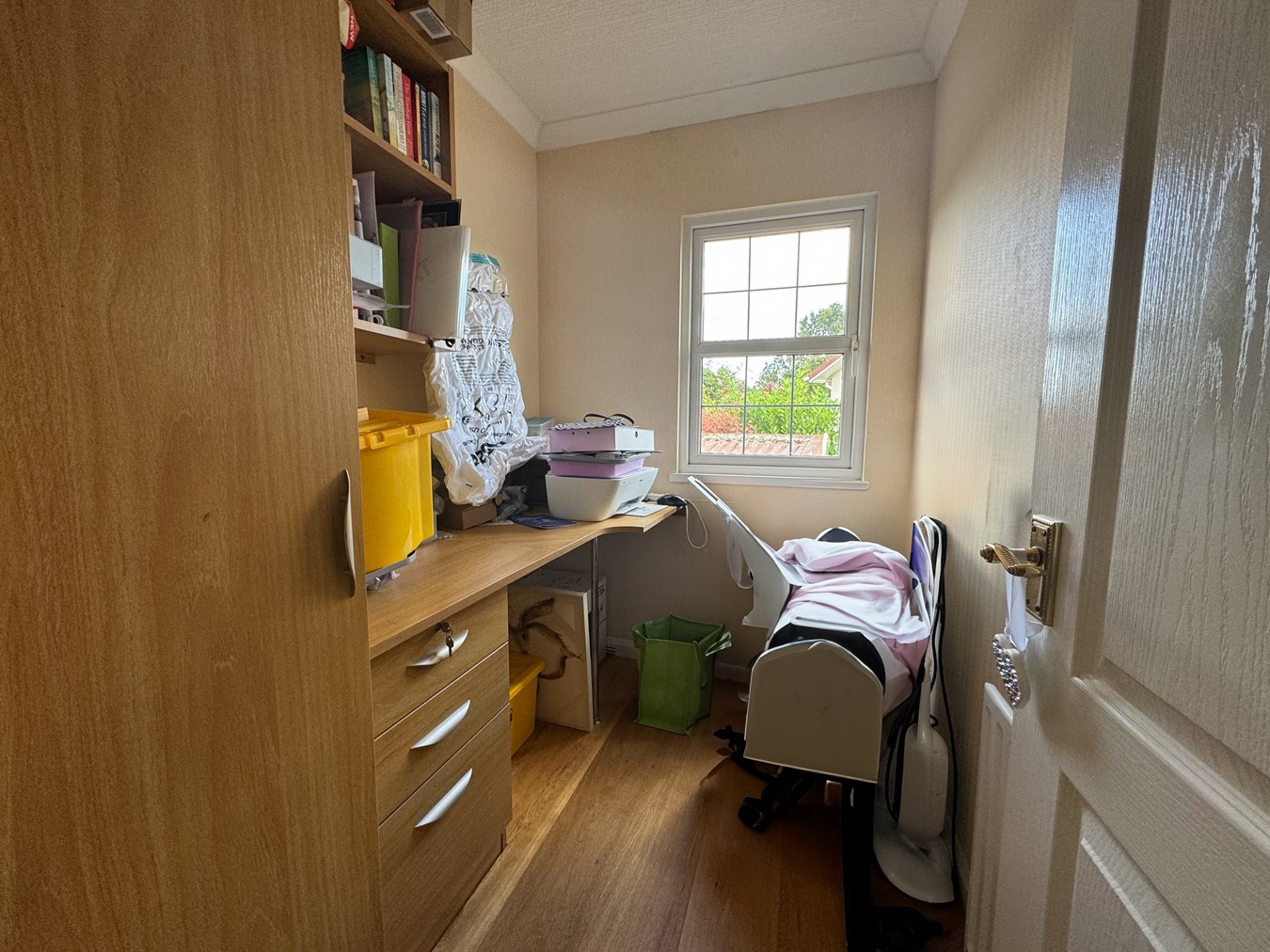 7' 0" x 5' 6" (2.13m x 1.68m) Fitted storage wardrobe and desk unit, window to the side.