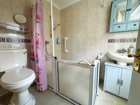 5' 8" x 7' 0" (1.73m x 2.13m) With shower cubicle with built in mains shower, low level W.C. wash hand basin, extractor, partially tiled walls, window to the side.