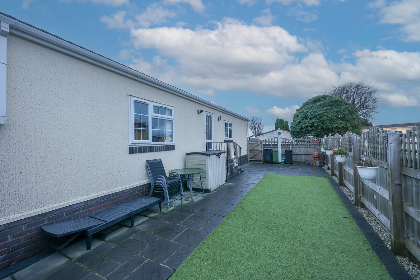 To the front, you'll find a level, enclosed gravel garden area, bordered by fencing, along with an allocated parking space to the right-hand side. The rear garden is thoughtfully designed, featuring a patio and an area of artificial grass. Additionally, there is a very practical storage unit. For added convenience and security, courtesy lighting is provided at both the front and rear of the property.