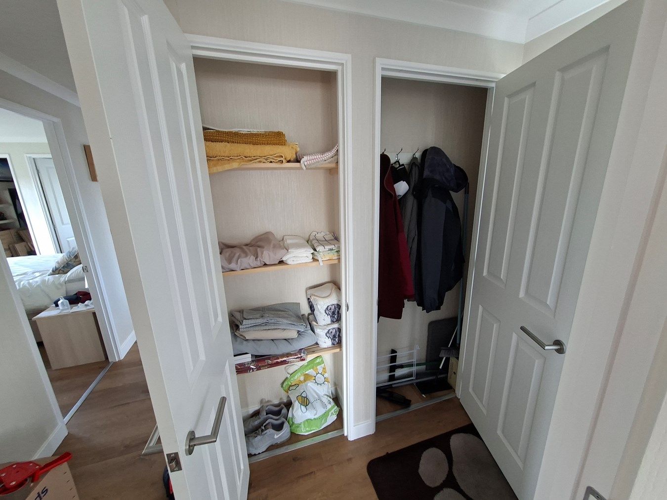Half glazed panelled Upvc door, two built in storage cupboards, central heating control.