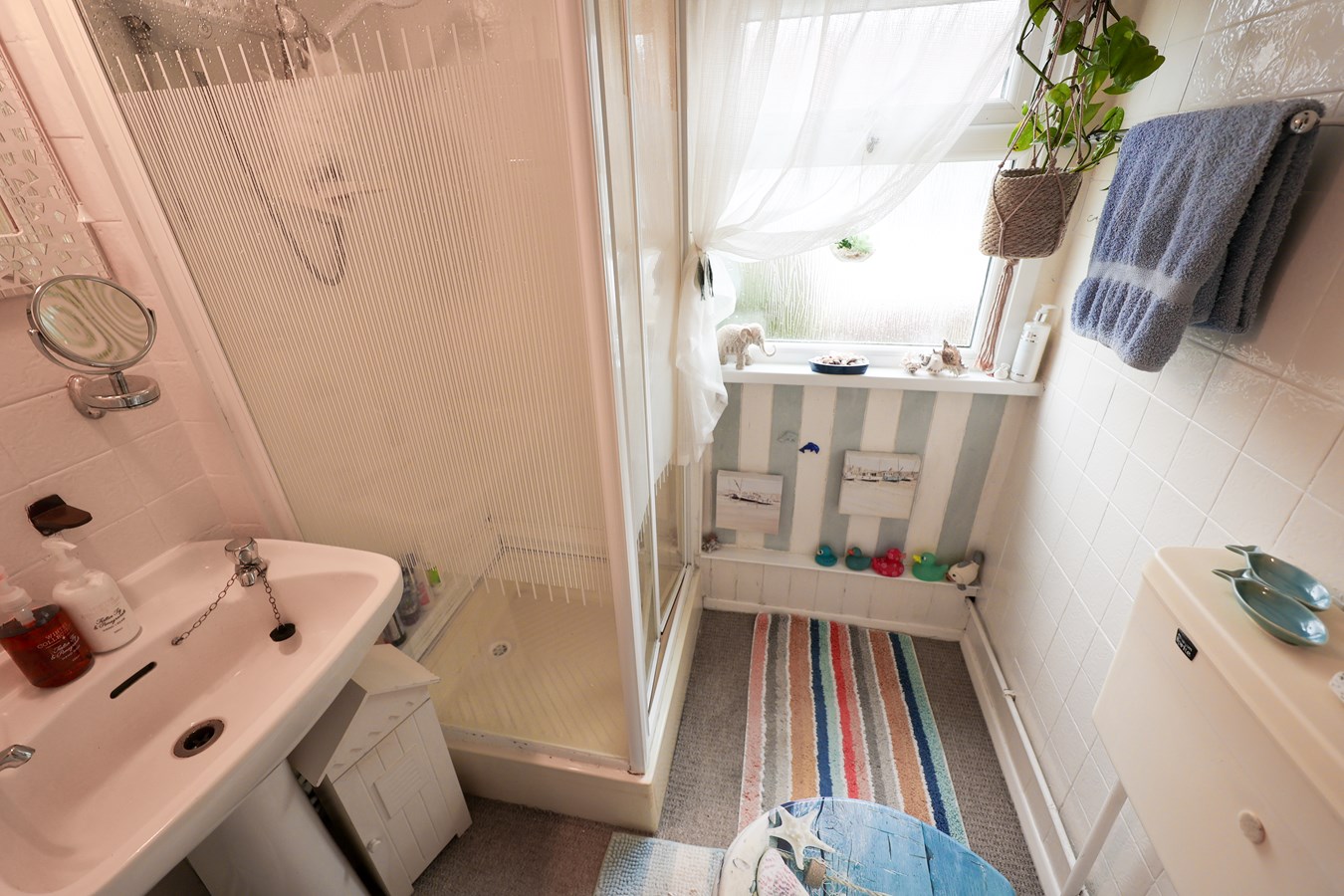 7' 0" x 5' 6" (2.13m x 1.68m) Window to the side, downflow heater, shower cubicle with electric Mira shower, low level W.C. wash hand basin. Built in shelved cupboard.