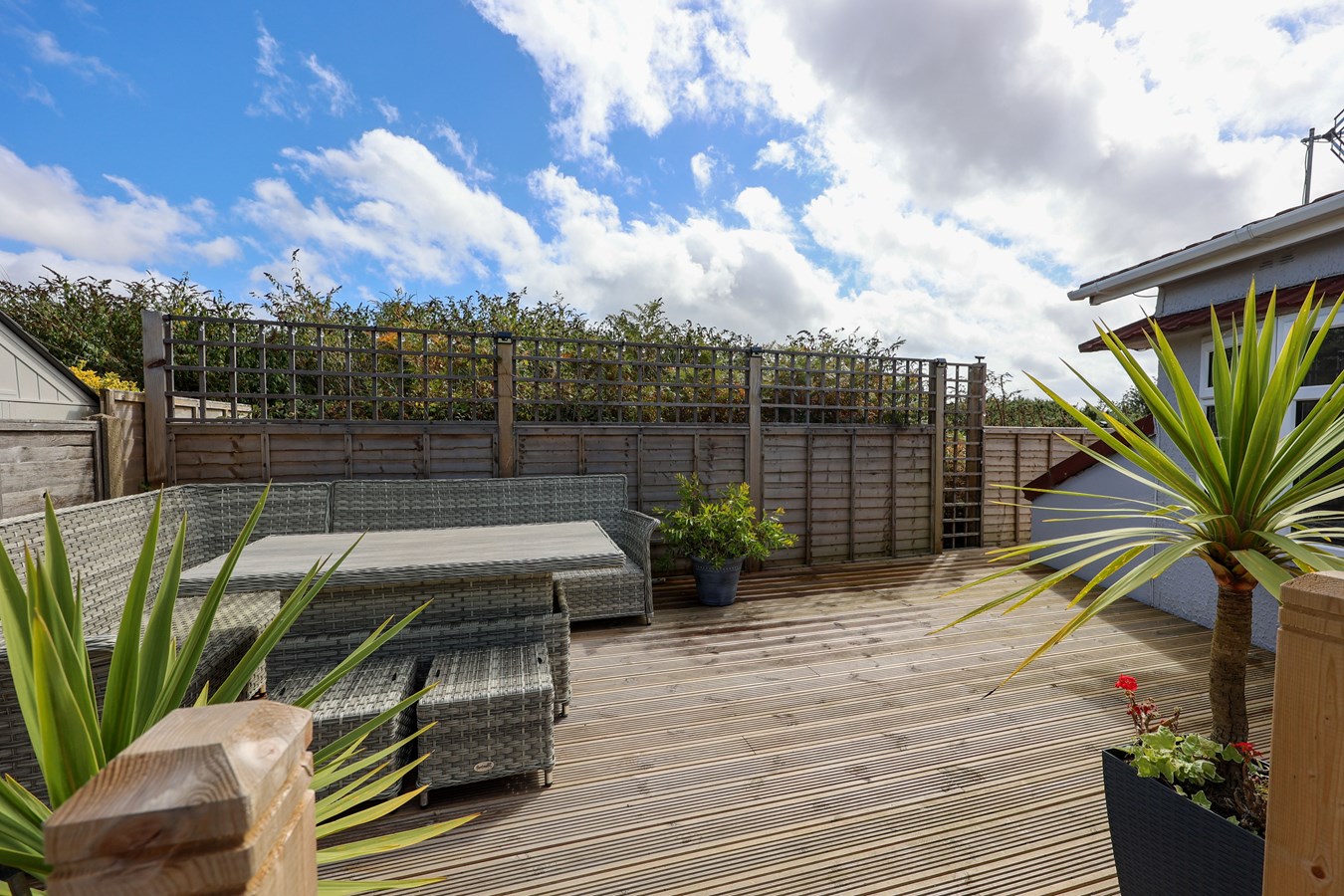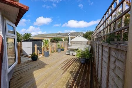 To the front of the property we have a tarmac driveway with parking for two cars and access to the garage which is available for an additional rent. There is also a small gravelled area and a newly fitted timber gate with fencing leading to the left hand side where there is an enclosed gravelled area and a sited a composite storage shed which is optional. From the gravelled area there is a small set of steps leading to a timber decked patio area. Leading to the rear the decking continues and provides access to a useful outside store. There is an electric charging point.