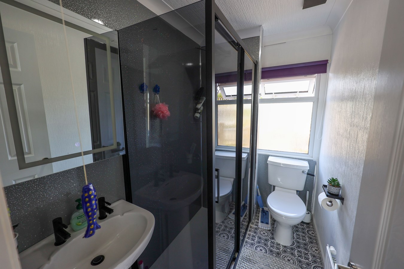 4' 5" x 7' 7" (1.35m x 2.31m) All refitted and included a double shower unit with tinted glass, waterfall shower head and hand held shower head, low level W.C. wash hand basin, extractor fan, radiator, window to the side. the shower room walls are finished in an easy to keep vinyl boarding.