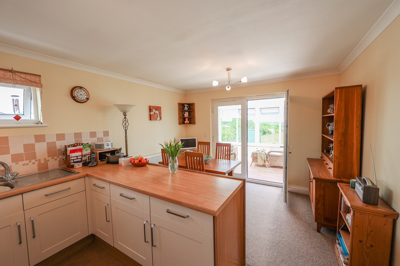 16' 4" x 10' 8" (4.98m x 3.25m) The kitchen, narrowing slightly at one end, is well-fitted with a mix of base units and high-level cupboards, complemented by a wood-effect roll-top work surface. It includes an integral dishwasher, larder fridge, freezer, and space for an oven with a stainless steel extractor above. A tiled splashback adds a stylish touch, while a side window and French doors leading to the conservatory enhance light and openness.